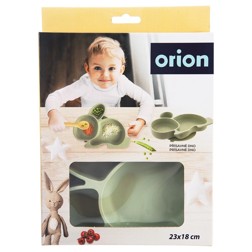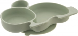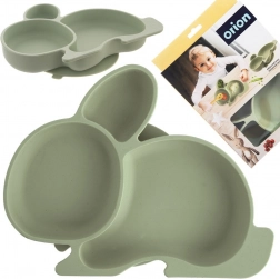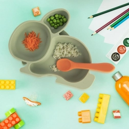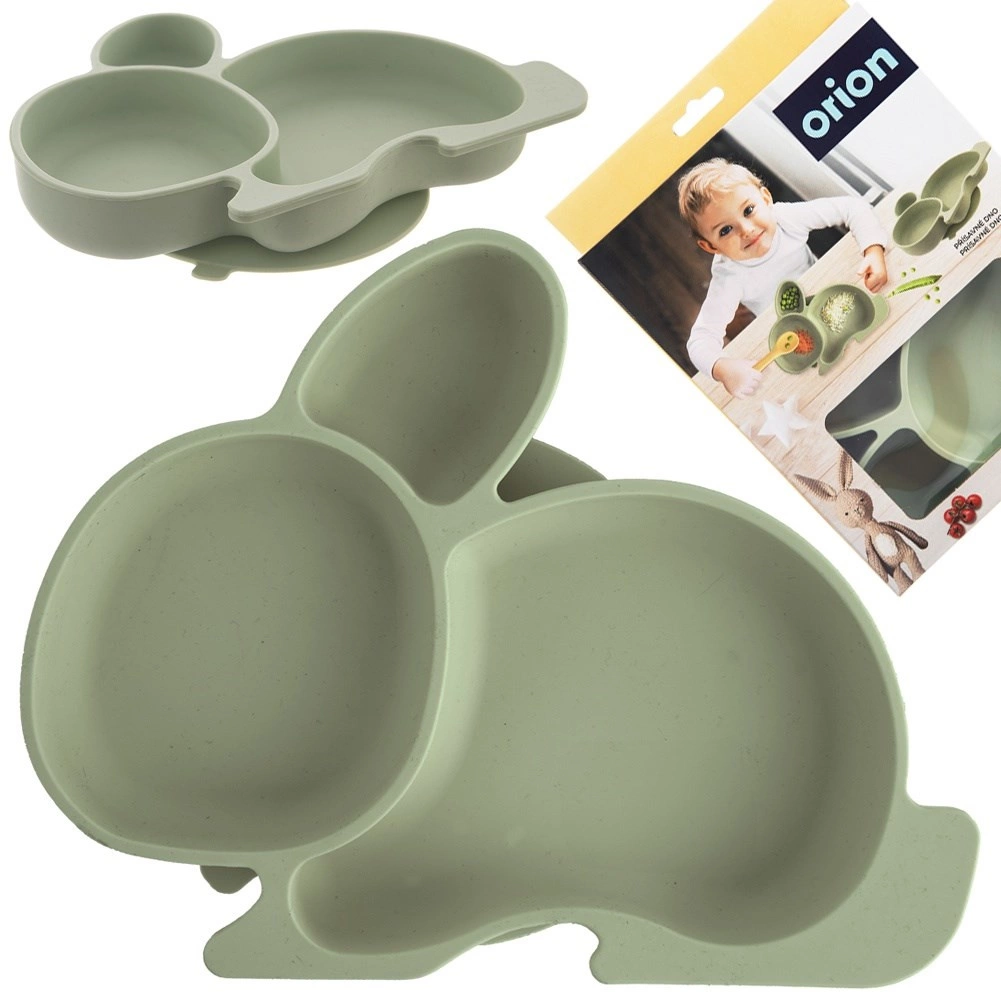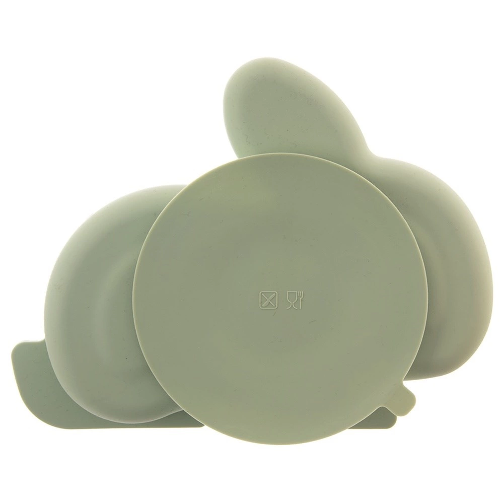 Pratico piatto per bambini con tre scomparti a forma di coniglietto per servire comodamente pasti e snack. Grazie alla forte ventosa aderisce saldamente al tavolo, resiste a temperature da -20 °C a +120 °C ed è adatto a lavastoviglie, microonde e congelatore. Realizzato in silicone di qualità di colore verde.