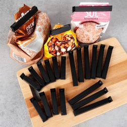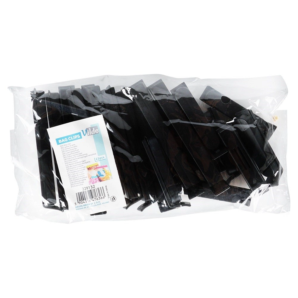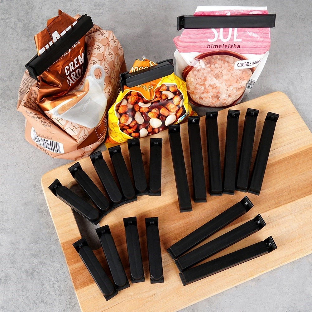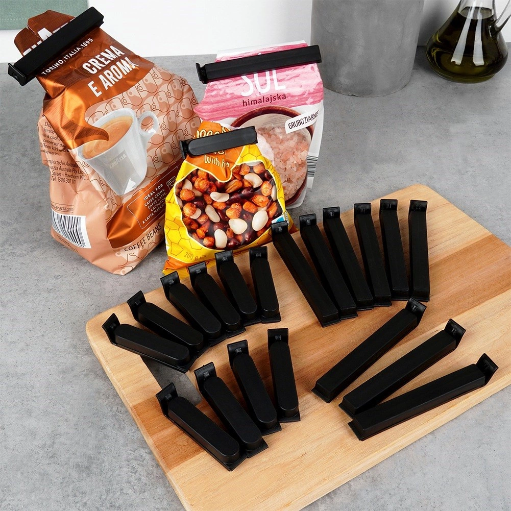 Pratico set di 22 clip per sacchetti in due dimensioni per sigillare in modo affidabile caffè, spezie, surgelati e pasta. Le clip in plastica nere garantiscono una chiusura ermetica, proteggono il contenuto da umidità e aria e aiutano a mantenere freschezza e ordine in dispensa. Facili da usare con un solo gesto e dimensioni compatte per una comoda conservazione.