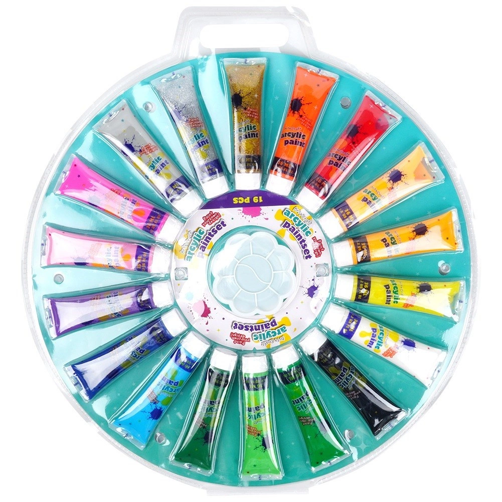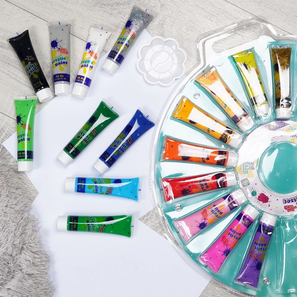 Scoprite il set universale di colori acrilici per progetti creativi: 18 colori in pratici tubetti da 36 ml e una tavolozza in plastica per miscelare le tonalità. I colori hanno pigmenti intensi e duraturi, ottima coprenza e sono adatti per carta, tela, legno e tessuto. Il set include anche varianti metalliche, perlate, neon e glitterate per risultati d’effetto.