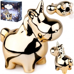 L’elegante salvadanaio dorato a forma di unicorno è sia una decorazione sia un pratico alleato per il risparmio quotidiano. Grazie alla finitura lucida a specchio dona all’ambiente un tocco di lusso e diventa un accessorio immancabile su una mensola, sulla scrivania o nella cameretta.