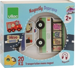 Set di magneti in legno con motivi di mezzi di trasporto, ideale per decorare la stanza dei bambini o il frigorifero. Realizzato in modo ecologico e rispettoso dell'ambiente.