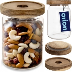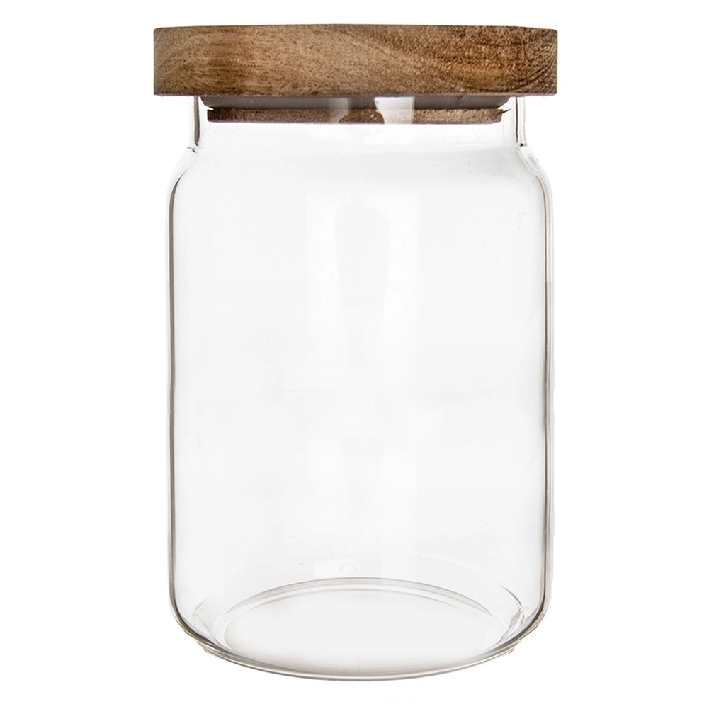 Pratico barattolo in vetro con capacità di 970 ml per una conservazione ordinata e igienica degli alimenti secchi. Realizzato in resistente vetro borosilicato e dotato di coperchio in legno con guarnizione in silicone per una ermeticità affidabile e una maggiore freschezza e aroma degli ingredienti. Adatto alla lavastoviglie (senza coperchio) e ideale per caffè, frutta secca, pasta, muesli o frutta essiccata.
