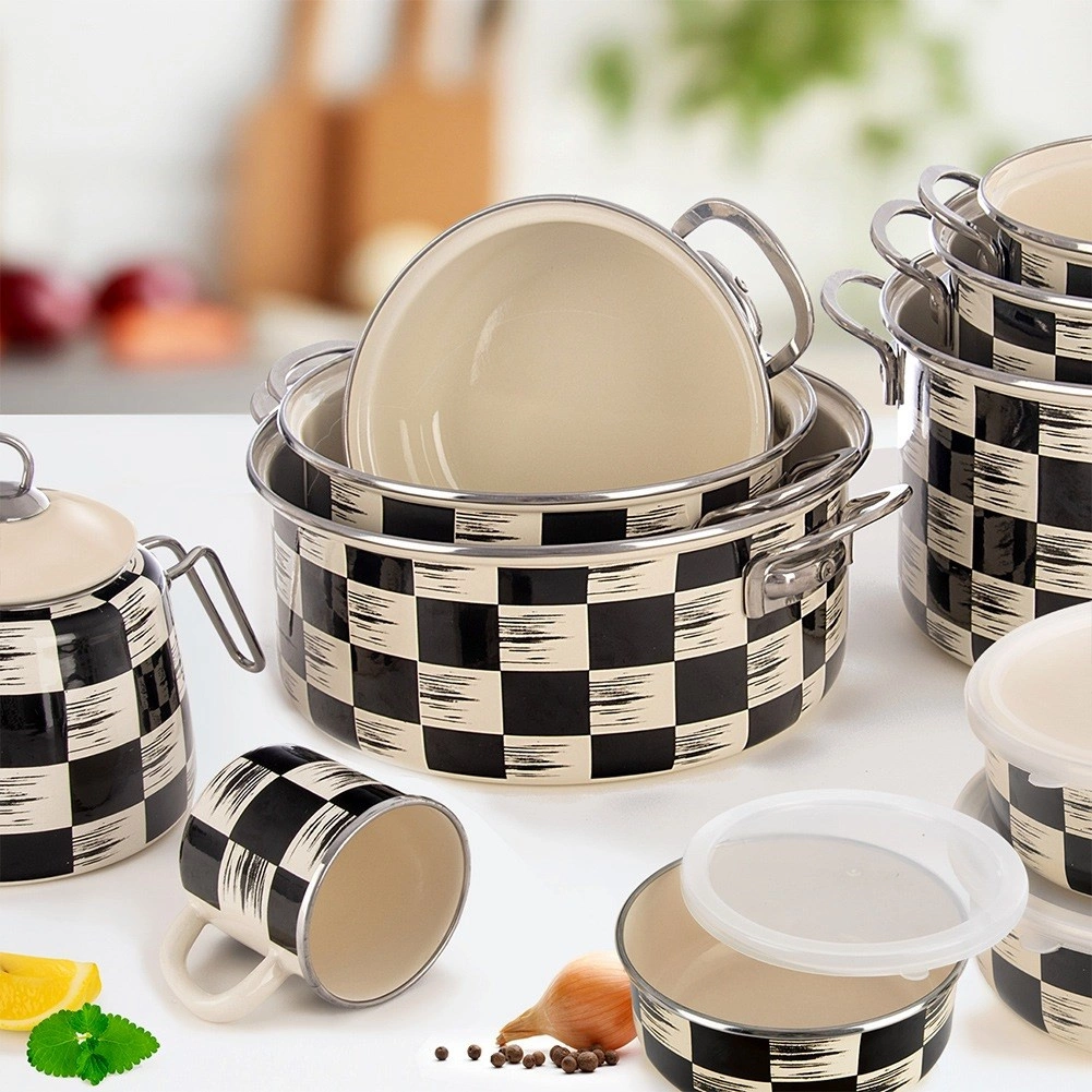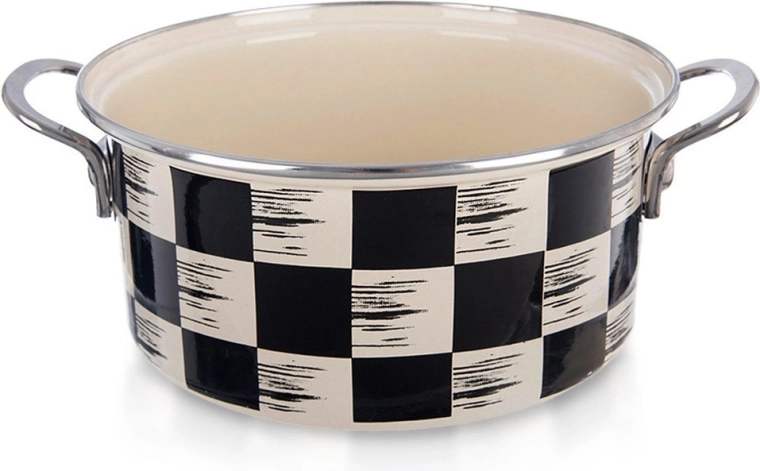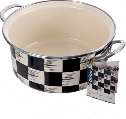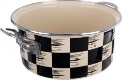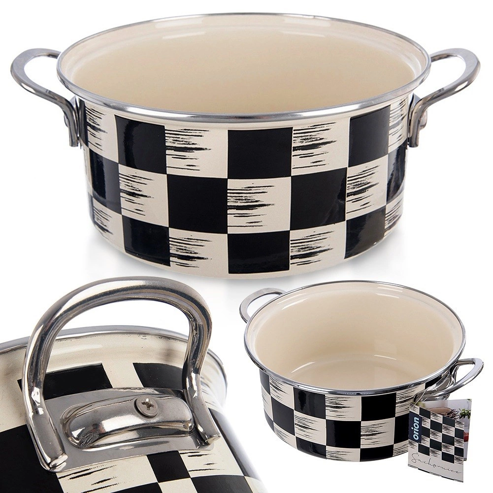 Pentola smaltata da 3 l con diametro di 22 cm e altezza di 10 cm, ideale per cuocere e stufare zuppe, salse e piatti monoporzione. Combina un design retrò con motivo a scacchi nero‑beige con acciaio smaltato resistente, bordo in acciaio inox e robuste maniglie in metallo. Adatta a tutti i tipi di piani cottura, inclusa induzione, al forno e alla lavastoviglie. Lo smalto è sicuro per la salute e adatto anche agli allergici.