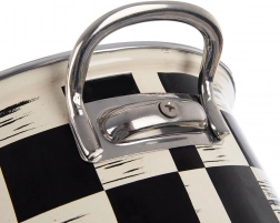 Questa pratica pentola in acciaio smaltato si distingue per l’uso universale e l’aspetto senza tempo. Il decoro a scacchiera in combinazione nero‑beige si inserisce perfettamente sia nelle cucine moderne sia in quelle rustiche. Lo smalto interno beige è liscio, facile da pulire e delicato sugli alimenti.