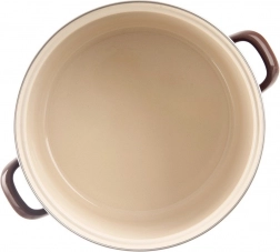 La pentola smaltata in stile retrò colpisce per la lavorazione robusta, l’ampia capacità e l’uso universale in cucina. L’esterno marrone, l’interno color crema e il bordo in acciaio inox conferiscono un aspetto elegante. Lo smalto è sicuro per la salute e adatto anche agli allergici.