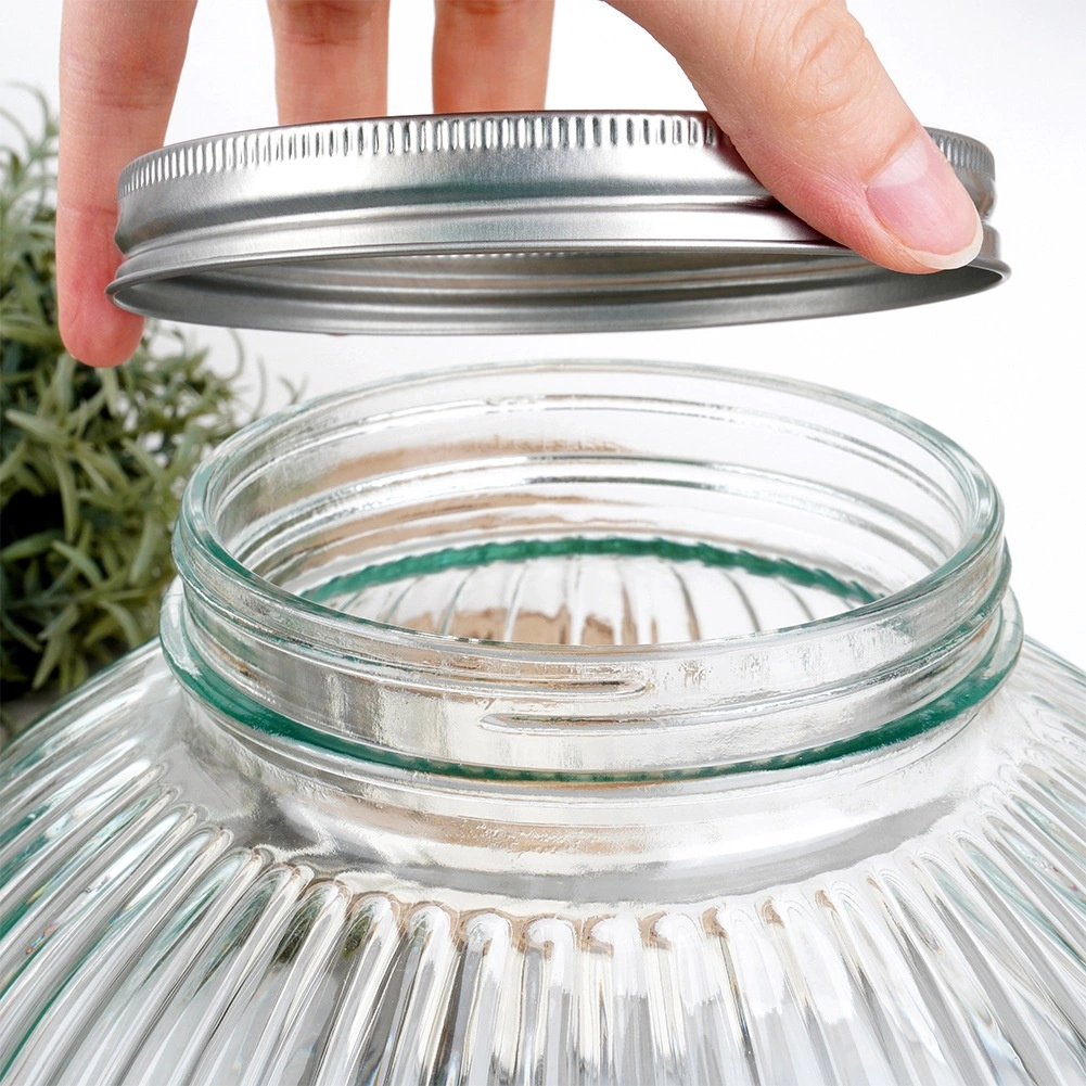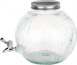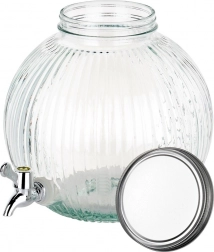 Elegante dispenser per bevande in vetro da 5,5 l con coperchio in metallo e pratico rubinetto, ideale per servire limonata, acqua con frutta, punch o tè freddo. Il robusto vetro scanalato, il collo ampio per un facile riempimento e pulizia e il coperchio a vite anti-insetti rendono questo erogatore una scelta perfetta per feste in giardino e celebrazioni in casa.