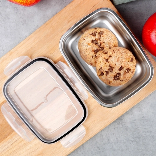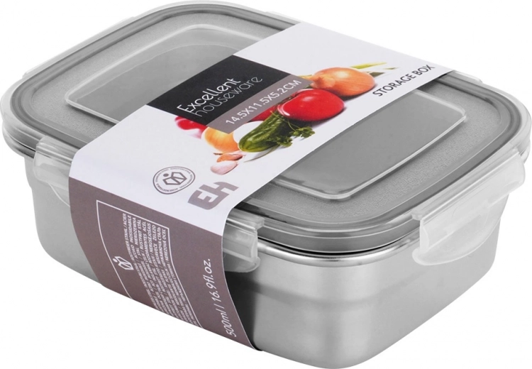 Pratico e igienico box porta alimenti in acciaio inox che protegge il cibo da umidità e aria, lo mantiene fresco più a lungo ed è perfetto per l’uso quotidiano. Grazie alle dimensioni compatte 14,5 × 11,5 × 5,5 cm entra facilmente in borsa o nello zaino scolastico e la capacità di 500 ml è ideale per insalate, contorni o spuntini.