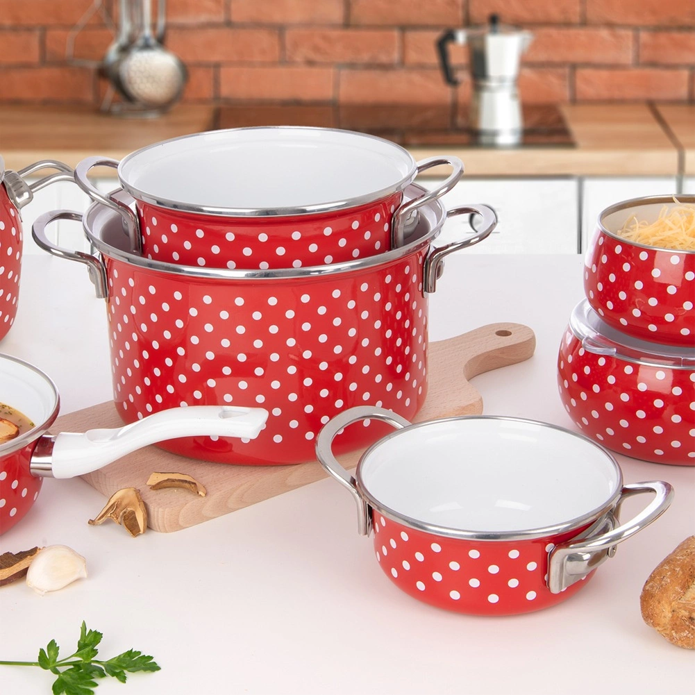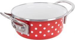 Pentola elegante e pratica in acciaio smaltato di qualità, di colore rosso con pois bianchi, che ravviva qualsiasi cucina. La costruzione robusta, l’anello e le maniglie in acciaio inox assicurano lunga durata e maneggevolezza. Le dimensioni compatte sono perfette per piccole porzioni, riscaldare, cuocere e stufare.