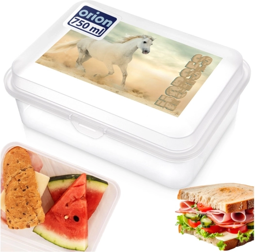 Questo lunch box leggero e resistente in plastica di qualità è una scelta eccellente per la scuola, le gite e i viaggi. Il design trasparente con un accattivante motivo di cavalli aiuta i bambini a riconoscere facilmente la propria scatola. Un unico scomparto capiente contiene panini, frutta, verdura e piccoli snack.
