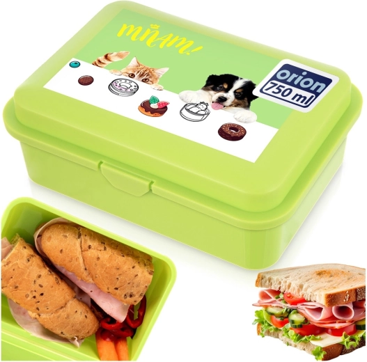 Pratico portapranzo da 750 ml di colore verde con un simpatico motivo di animaletti, ideale per panini, spuntini e piccoli oggetti. Misura 18 × 13 × 7 cm, una scelta leggera e resistente per i bambini, a scuola e in gita. Materiali sicuri per alimenti, chiusura a clip facile e lavabile in lavastoviglie, utilizzabile anche nel forno a microonde (con coperchio aperto fino a 400 W).