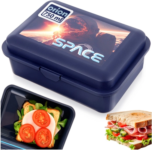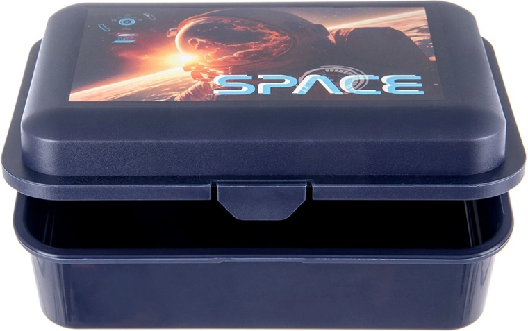 Elegante e resistente porta-pranzo con un accattivante motivo spaziale e la scritta SPACE, piace a bambini e adulti. La semplice struttura monoscomparto e la forma rettangolare offrono spazio sufficiente per sandwich, frutta e altre bontà. Il box è leggero, realizzato con materiali sicuri neutri per gli alimenti e conforme agli standard europei.