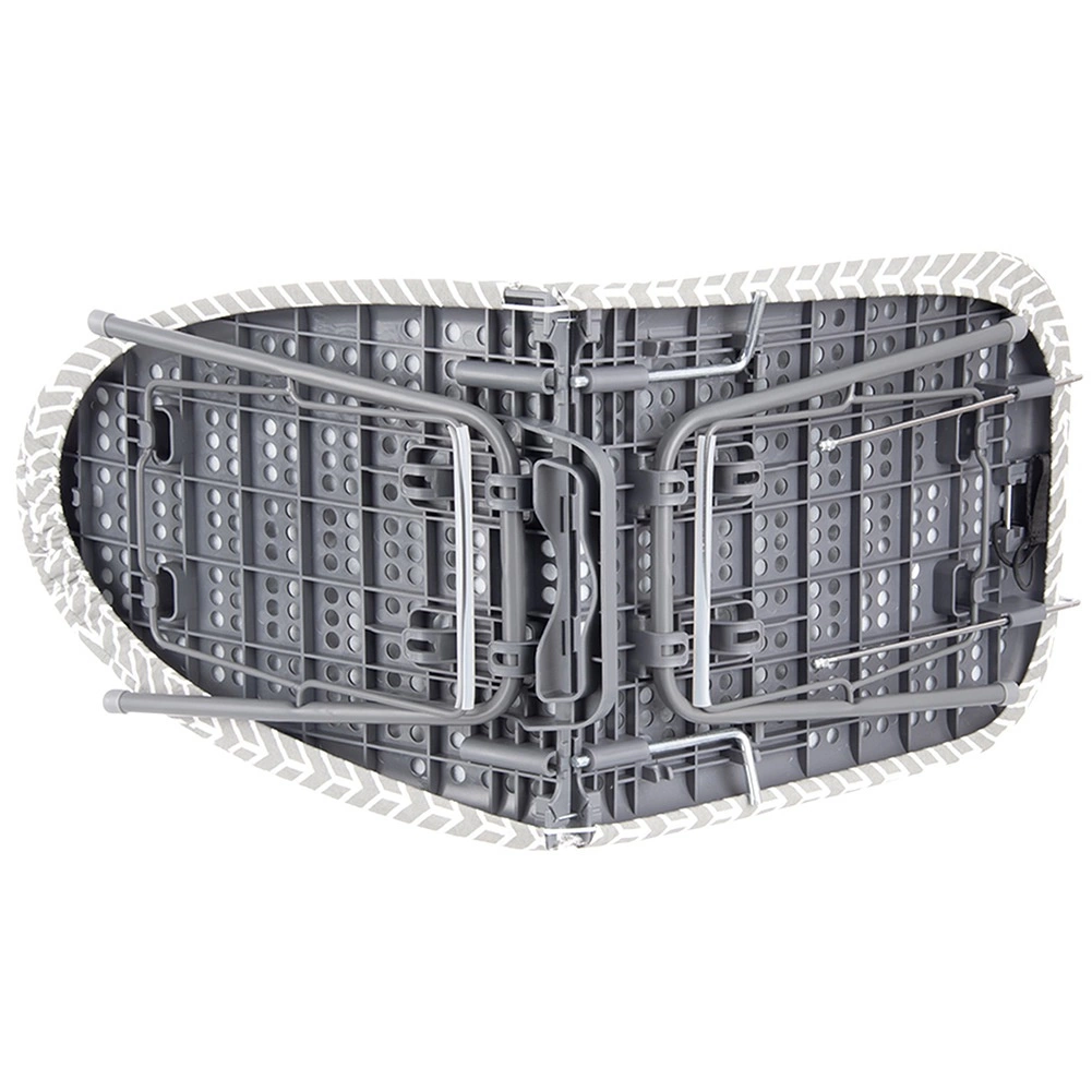 Il telaio in metallo color grigio, i piedini antiscivolo e il blocco contro la chiusura accidentale garantiscono stirature sicure e confortevoli su qualsiasi tavolo.