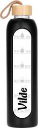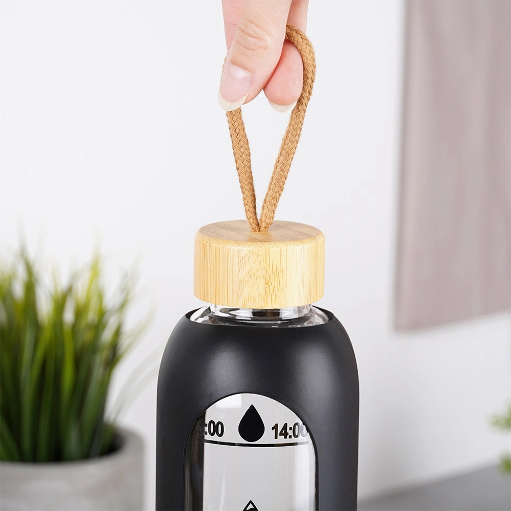 Il rivestimento in silicone nero protegge il vetro e garantisce una presa sicura, mentre il tappo in bambù naturale con laccetto facilita il trasporto.