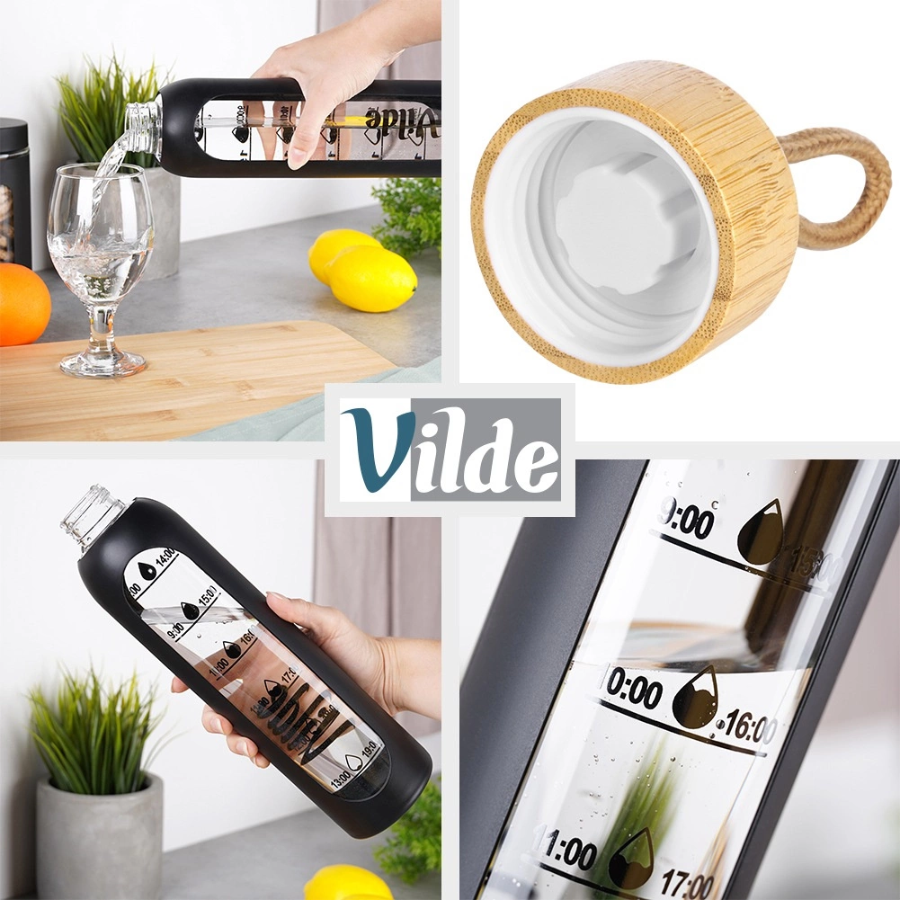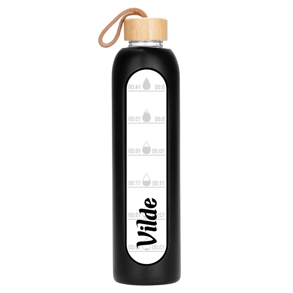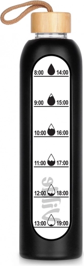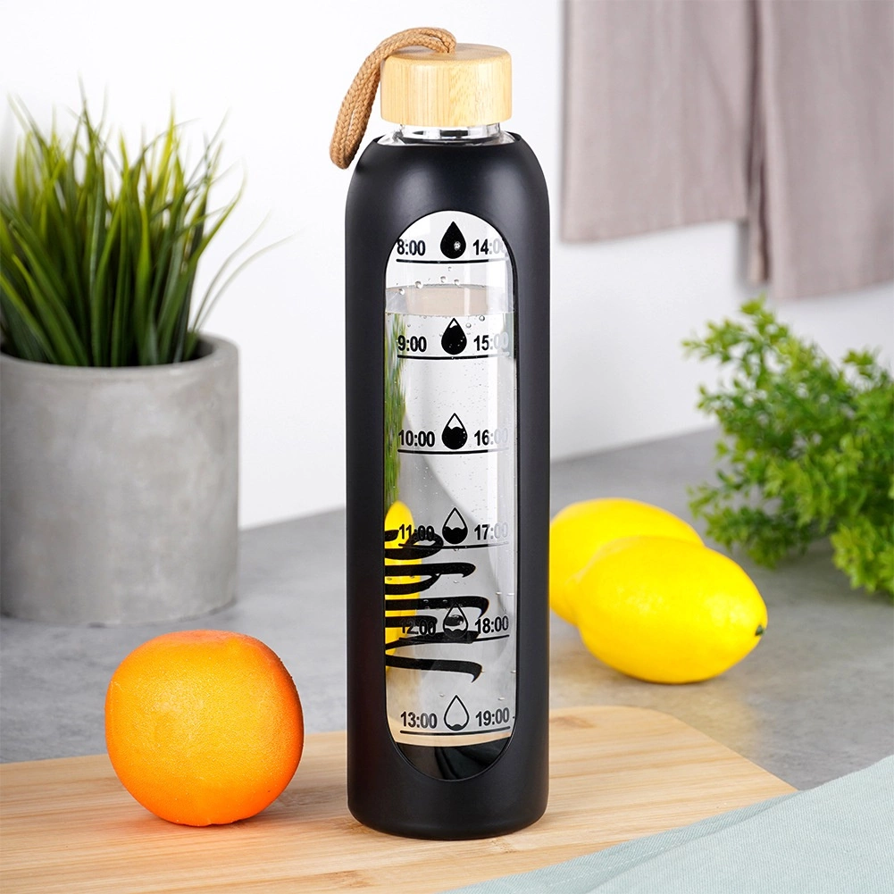 Resta idratato con stile anche fuori casa. Questa elegante bottiglia in vetro da 1 l con rivestimento in silicone nero e tappo a vite in bambù è ideale per acqua, limonate fatte in casa, succhi, smoothie e cocktail. Le tacche orarie dalla mattina alla sera ti guidano delicatamente a bere con regolarità.