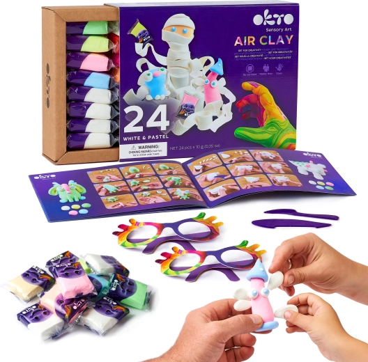 Il set OKTO offre tutto ciò che serve per iniziare subito a creare: dalla ricca palette di colori agli strumenti utili e alle istruzioni. La pasta è leggera, piacevole al tatto e pronta all’uso appena aperta. Dopo la modellazione, basta lasciare i lavori asciugare naturalmente.
