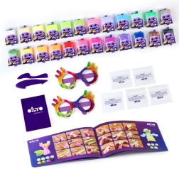 - 24× confezioni di pasta (10 g), istruzioni illustrate, strumenti per modellare, 5× sacchetti richiudibili, 2× occhiali di carta