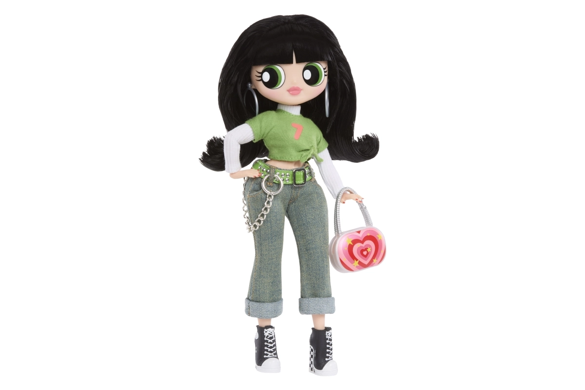 Crop top verde, jeans con catenella e sneakers nere abbinati a una borsa appariscente e orecchini – l’iconico look di Buttercup in versione L.O.L.