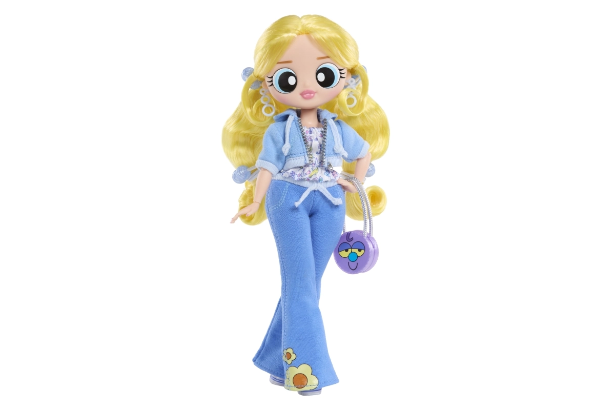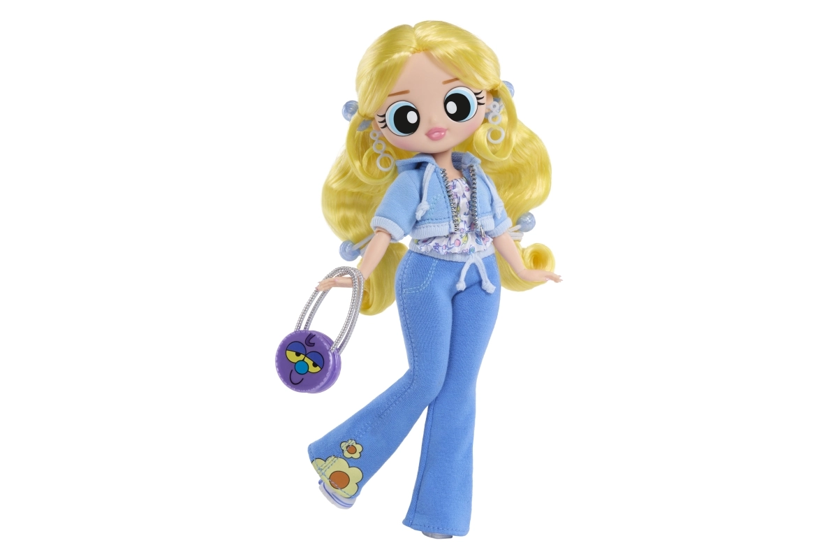Bubbles arriva con un outfit blu con elementi floreali e l’iconica borsetta – ideale per storie di moda e collezione.