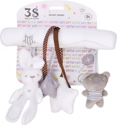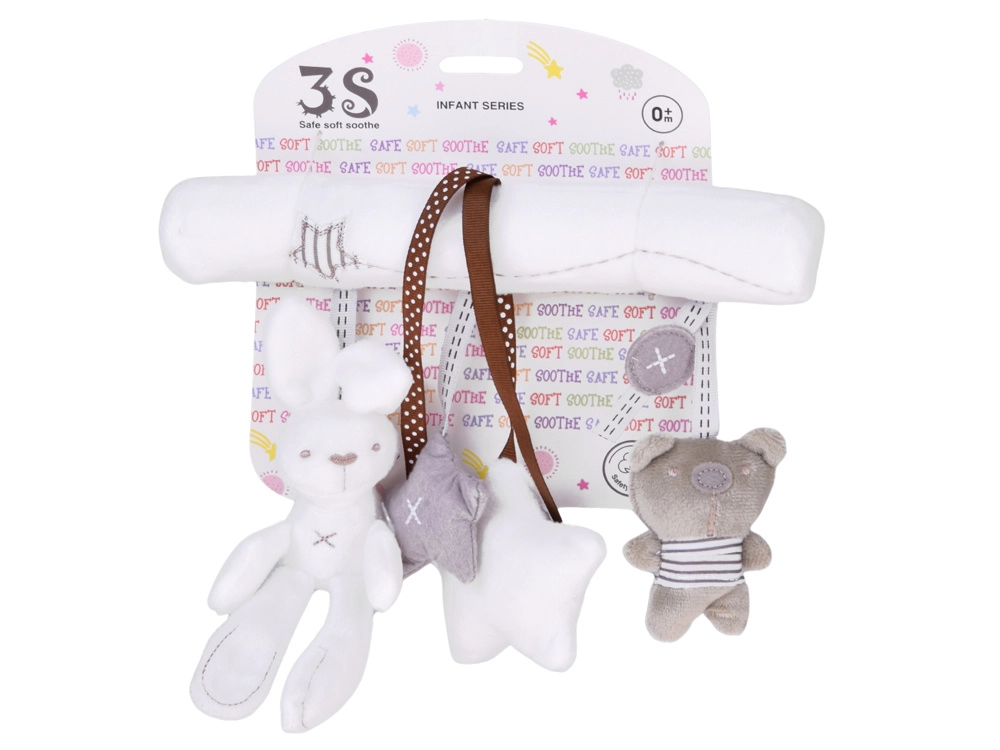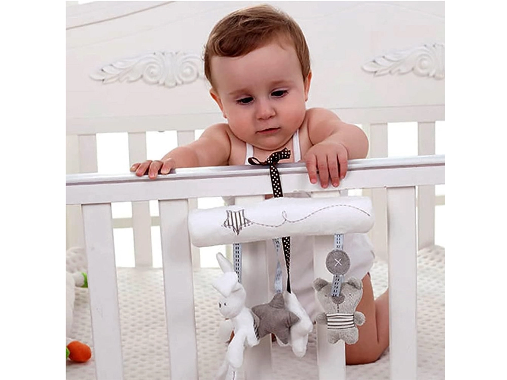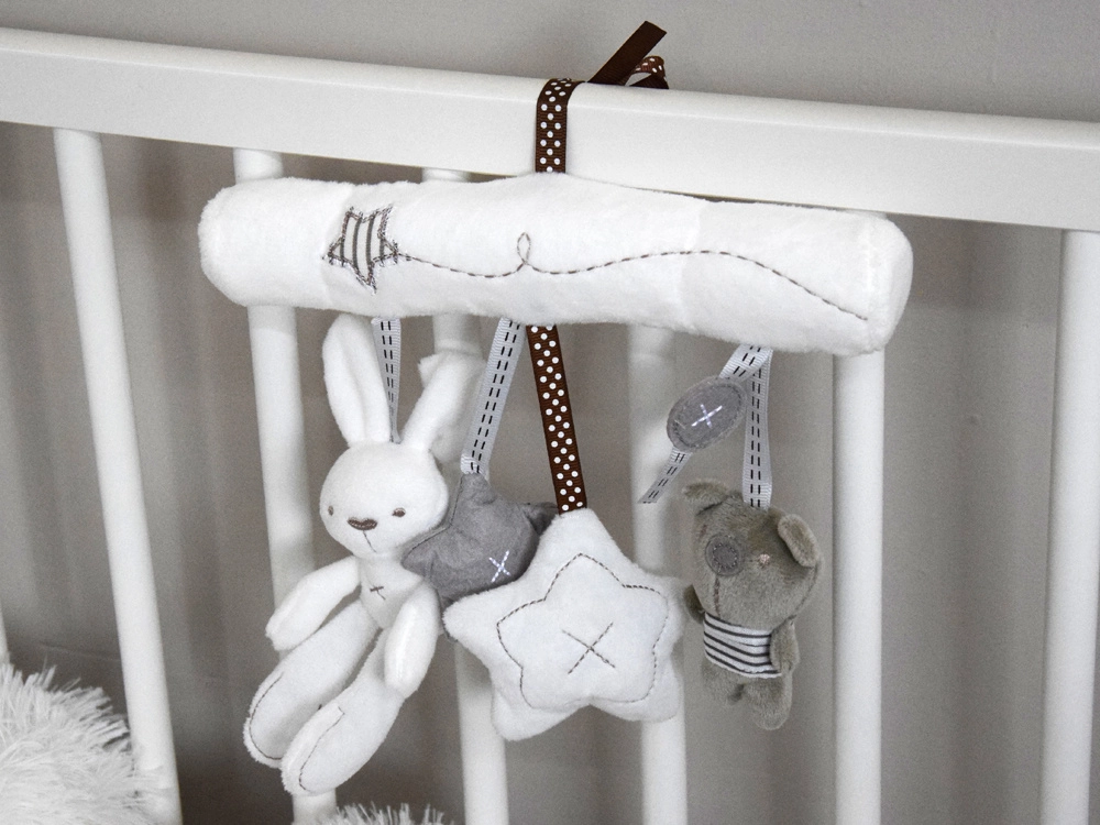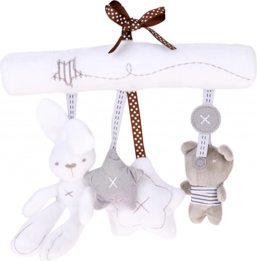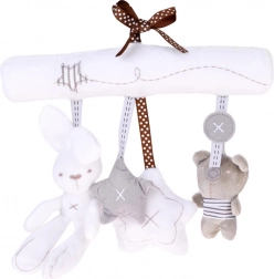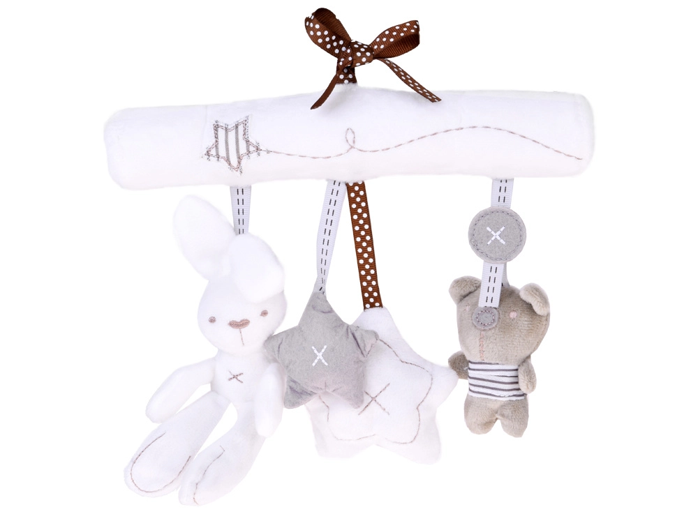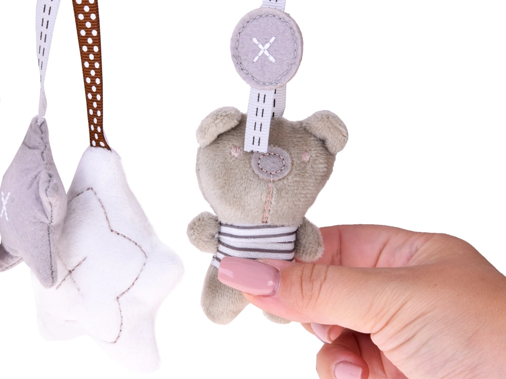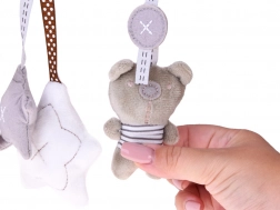 Un adorabile giocattolo appeso in colori neutri farà felice il bebè a casa e in viaggio. Si fissa facilmente al lettino o al passeggino con i nastrini. Offre morbido peluche vellutato, delicata stimolazione sensoriale e suoni divertenti: premendo il pancino del coniglietto parte una breve melodia, la stellina bianca ha un fischietto e l’orsetto funziona come sonaglino.