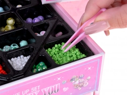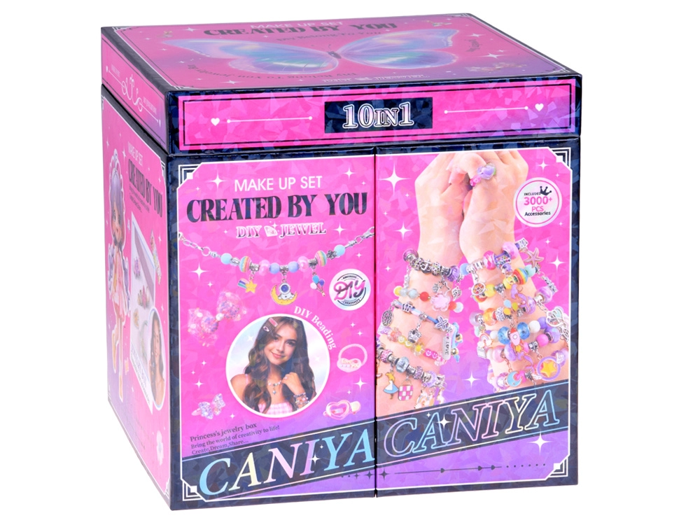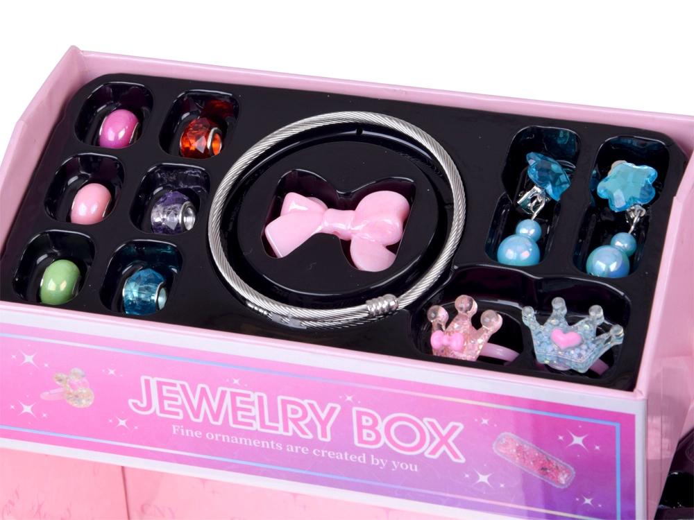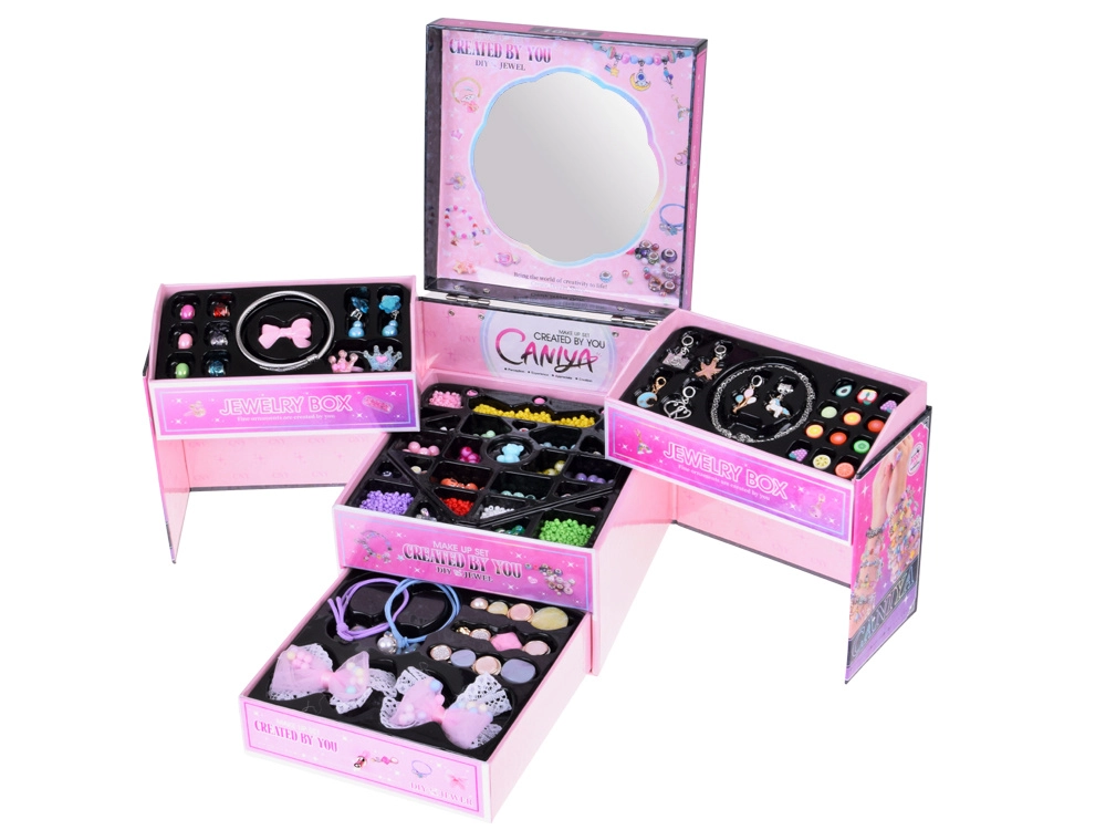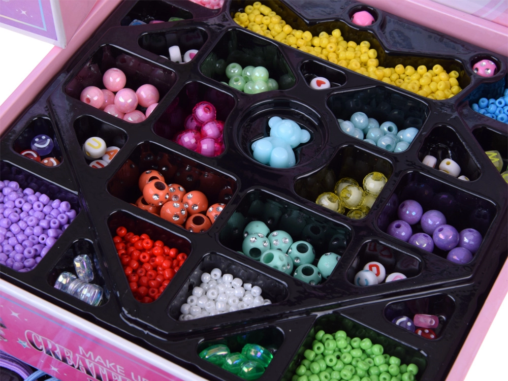 La gioielliera offre tre livelli ben organizzati: in alto un grande specchio e scomparti per anelli, orecchini e accessori per bracciale e collana; al centro perline colorate di varie forme e dimensioni per un’infilatura facile; in basso accessori per capelli – elastici, mollette e fiocchetti per rifinire lo styling. Grazie al filo elastico e alla pinzetta, l’infilatura è comoda anche per i principianti.