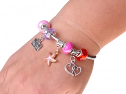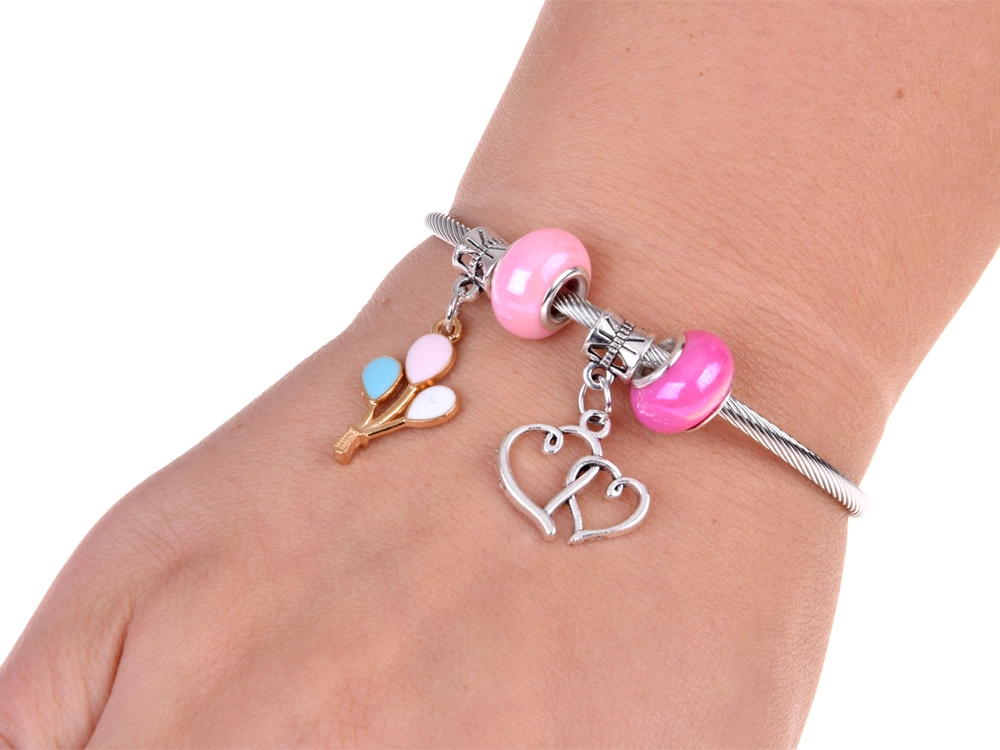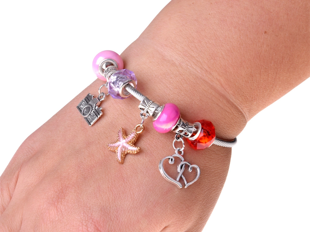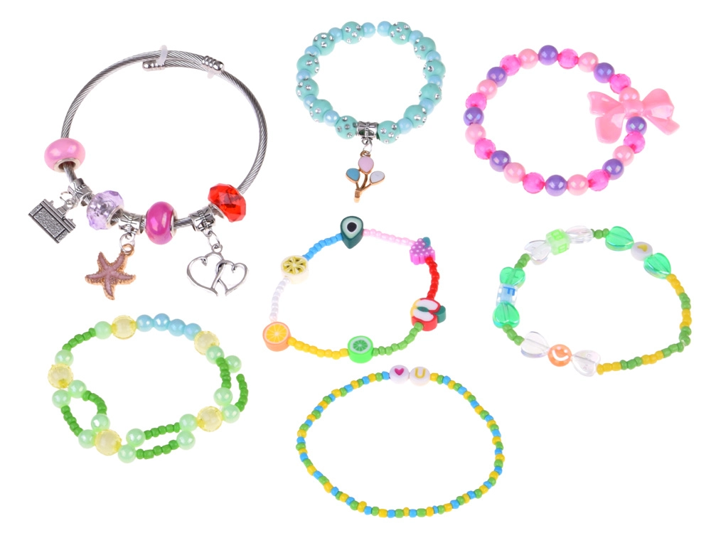 - Accessoristica completa: perline, ciondoli, bracciale metallico, catenina, orecchini a clip, 2 anelli, filo elastico, pinzetta, elastici per capelli, mollette, fiocchetti