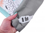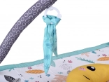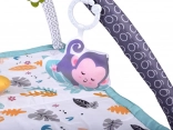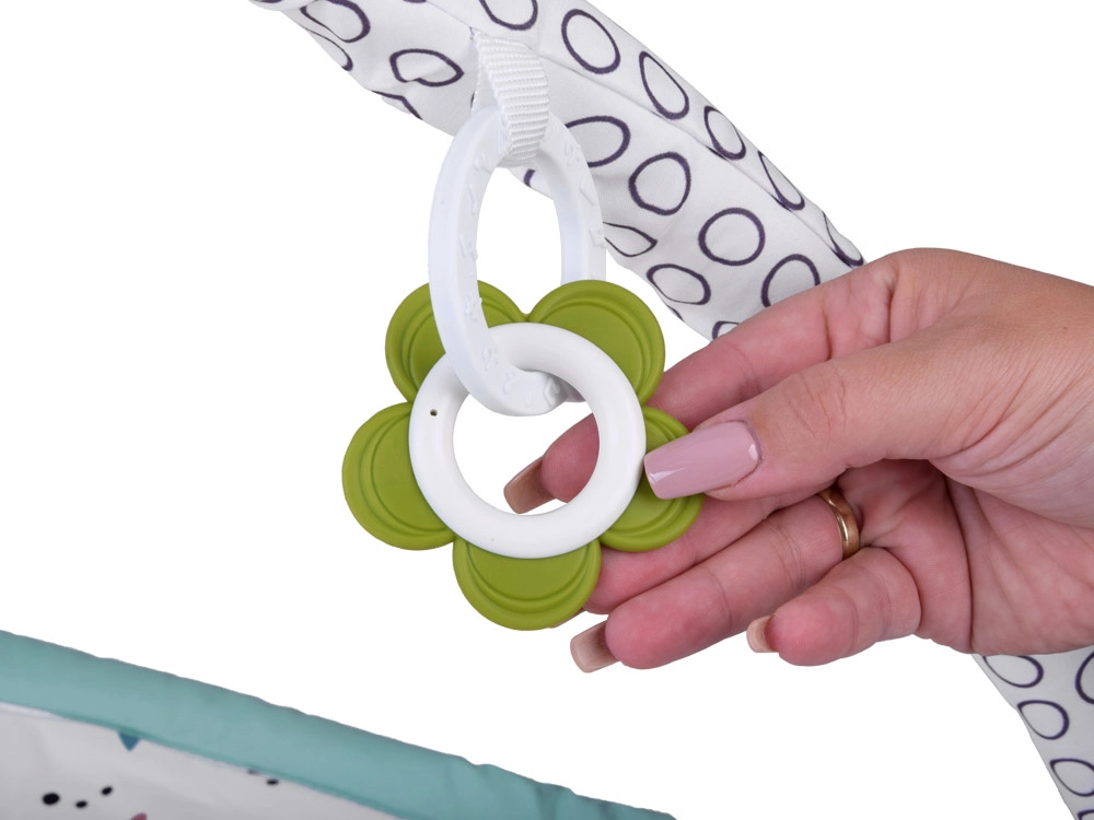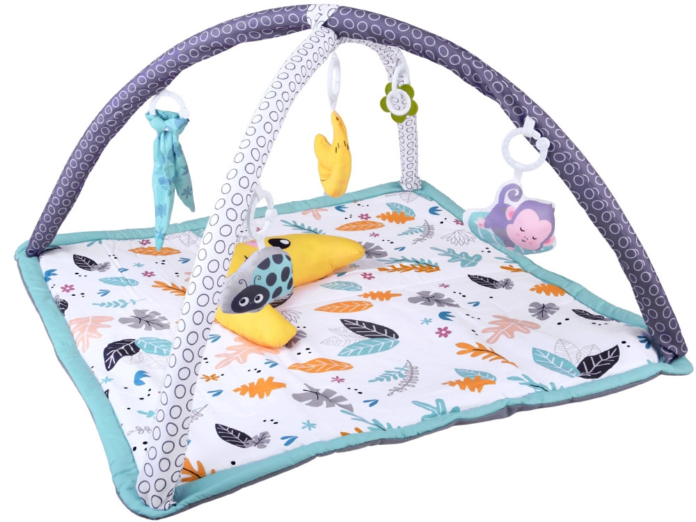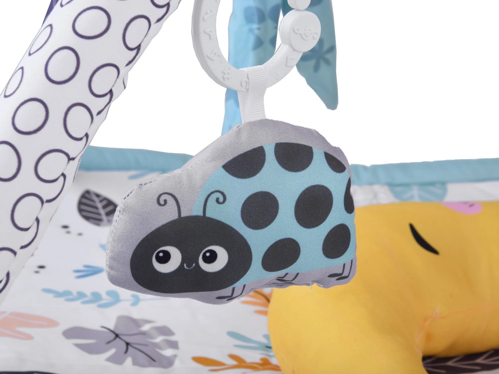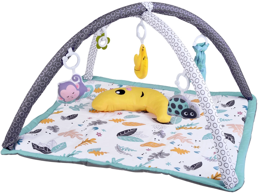 Questo tappeto gioco multifunzione in delicato stile scandinavo offre al bebè uno spazio confortevole e isolato sul pavimento. Due archi incrociati con giocattoli sospesi (bananina, coccinella, scimmietta, fiore–massaggiagengive e altri) invitano ad allungarsi e ad afferrare, rafforzando naturalmente braccia, collo e tronco e favorendo la coordinazione mano–occhio. È incluso anche un morbido cuscinetto di supporto, ideale per il tummy time.