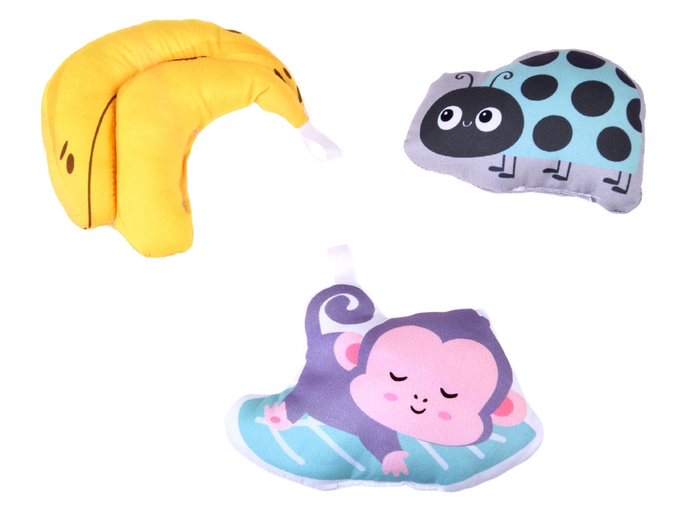 I giocattoli sospesi, tra cui foglietti fruscianti, una morbida scimmietta con squeaker, una banana in tessuto, una dolce coccinella con campanellino e un fiore–massaggiagengive, incoraggiano il bebè a esplorare e afferrare.