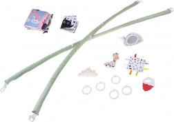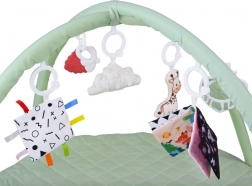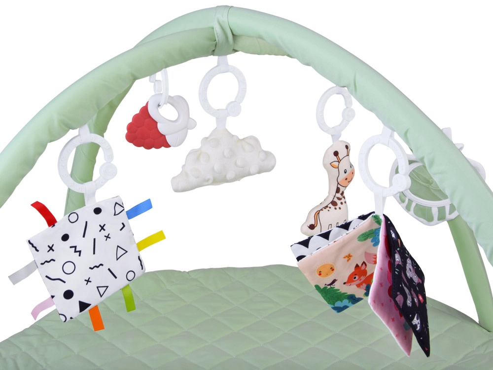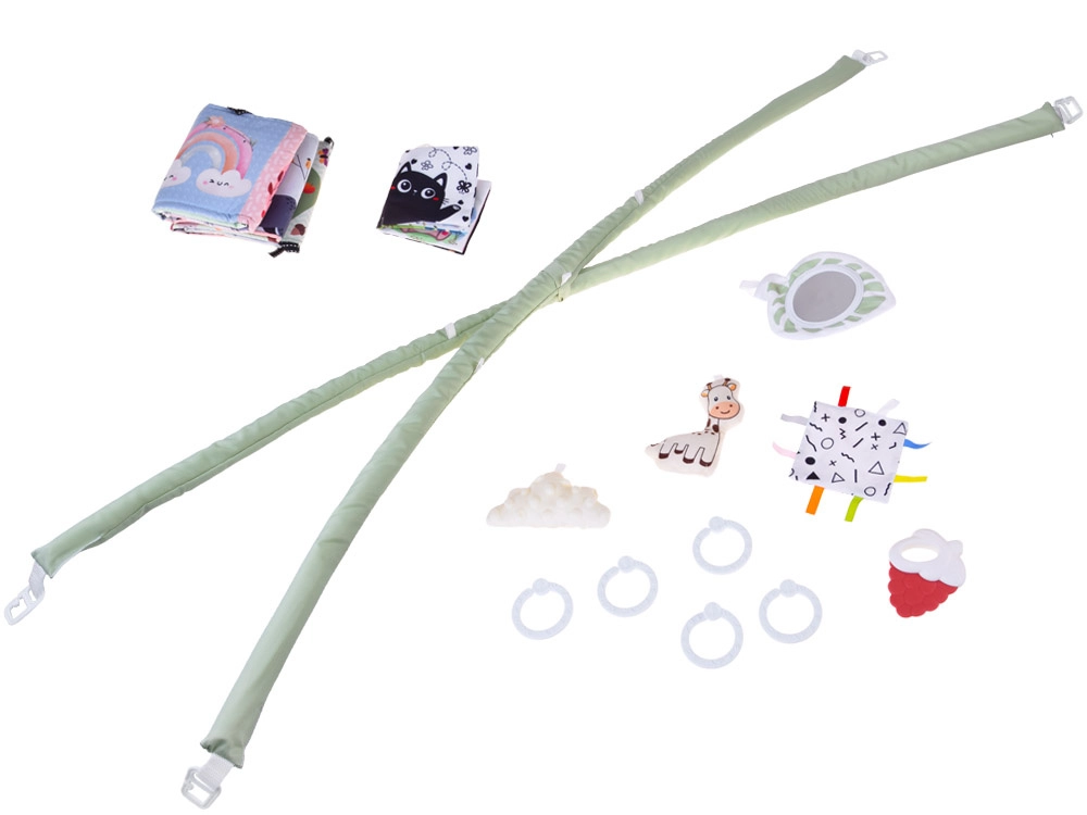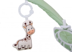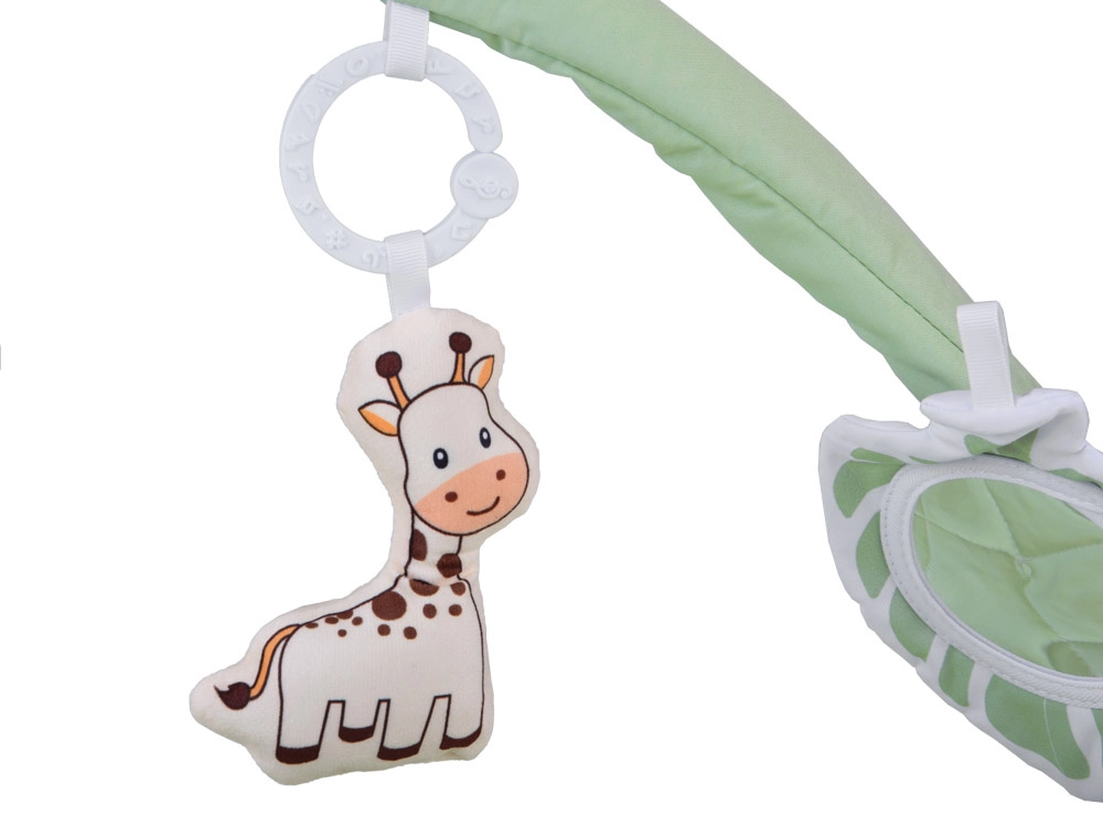 Due archi flessibili si sganciano facilmente per il lavaggio o i viaggi. I giochi appesi – massaggiagengive, nuvoletta, giraffa e quadrati fruscianti – invogliano ad allungarsi e stimolano i sensi.