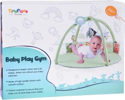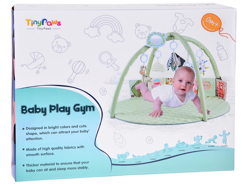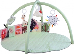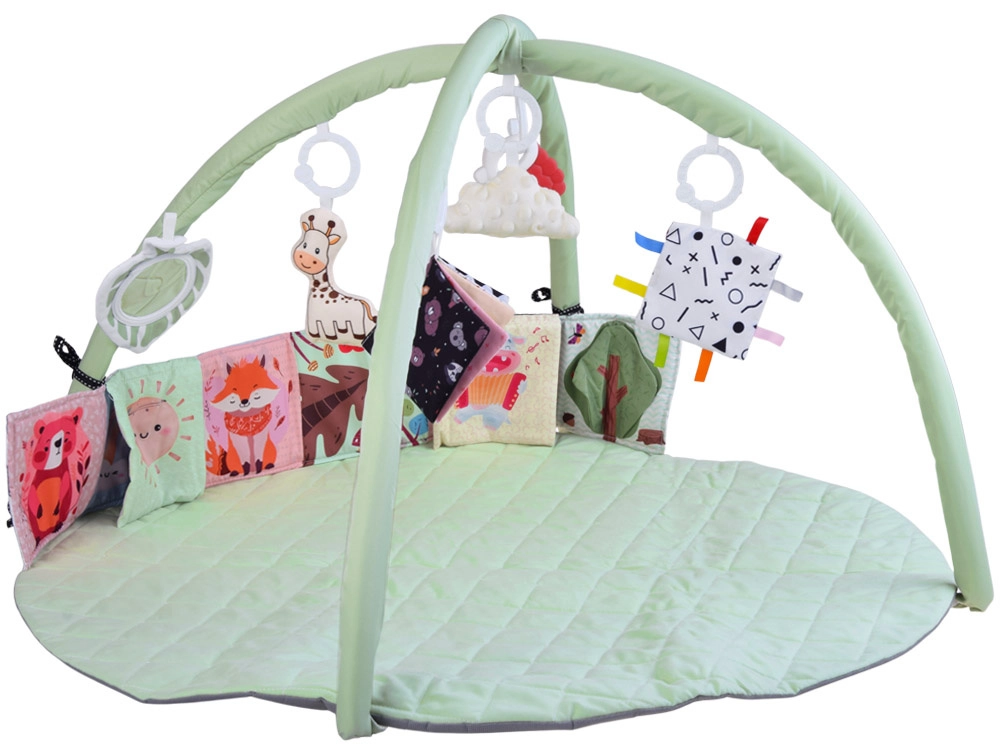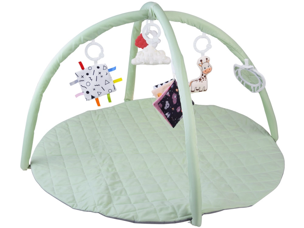 Morbido tappeto gioco rotondo con due archi removibili e un ricco set di giochi, pensato per sostenere lo sviluppo del bambino fin dai primi giorni. Offre imbottitura confortevole per il tummy time, giochi sospesi per afferrare e seguire con lo sguardo, libricino a contrasto, specchietto sicuro, sonaglino e massaggiagengive per stimolare i sensi e la motricità fine.