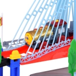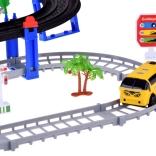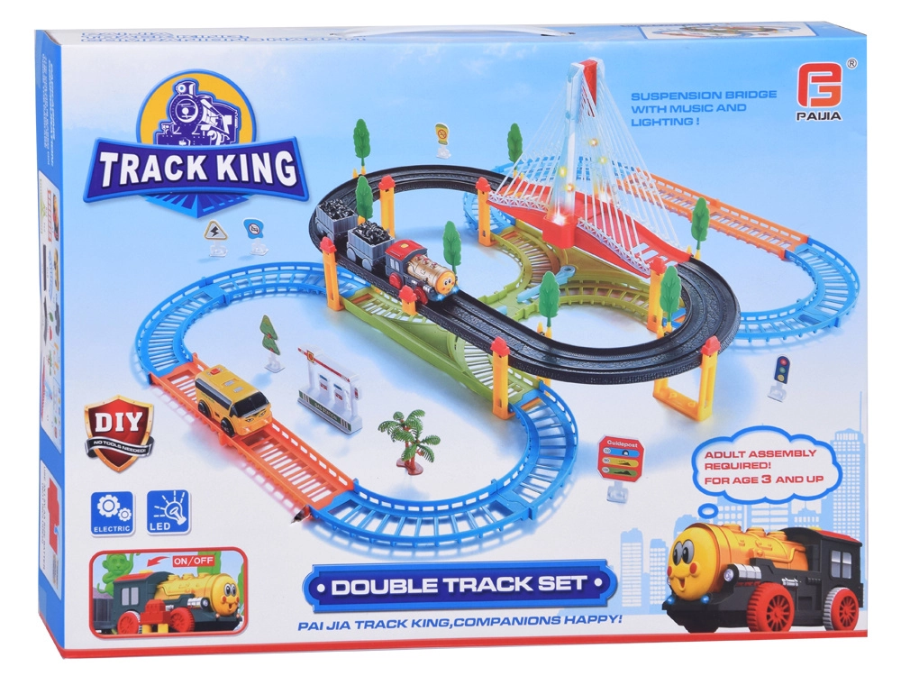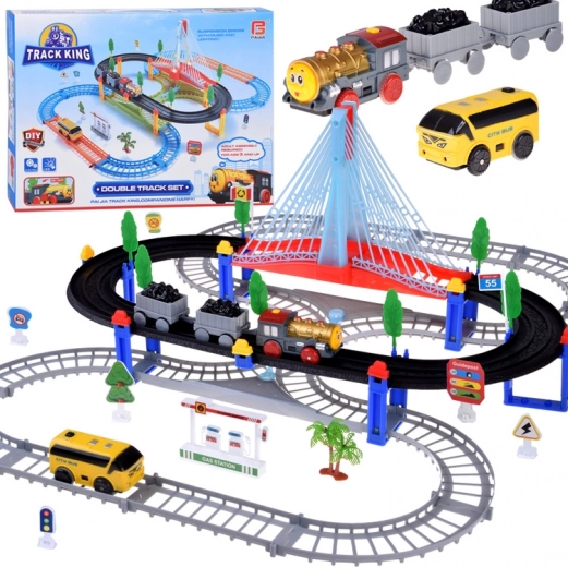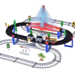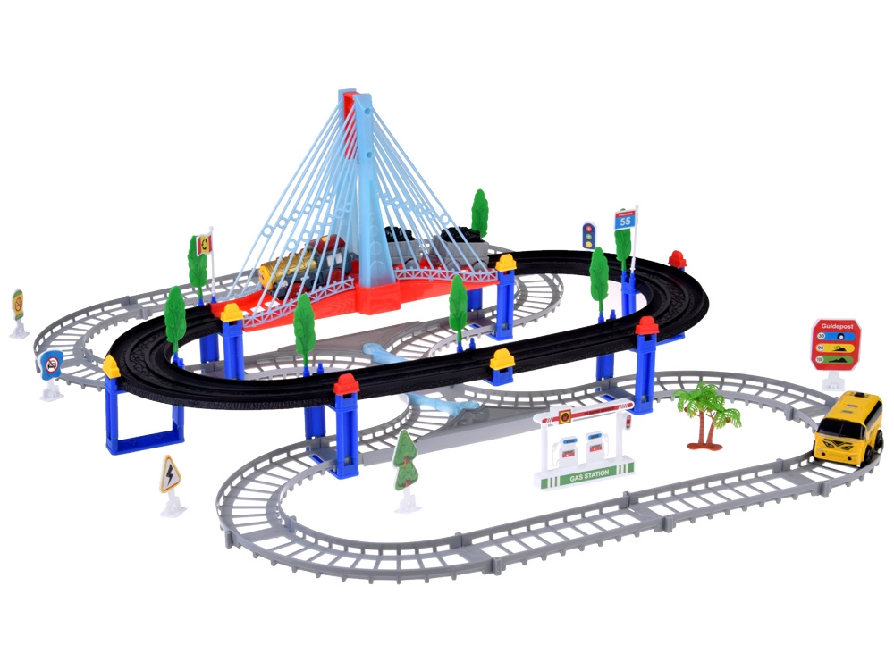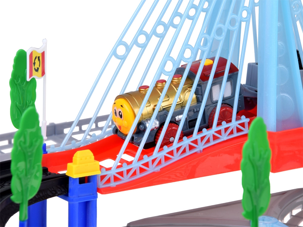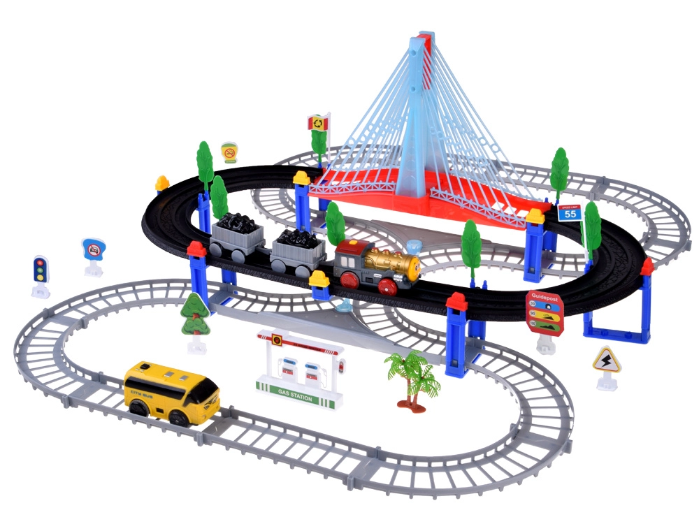 Questa pista ferroviaria elettrica con binari multilivello e ponte sospeso offre ai bambini ore di gioco creativo. La locomotiva con vagoni e l’autobus urbano giallo si muovono su tracciati collegati, attraversano il ponte e costeggiano segnali stradali, alberelli e una piccola stazione di servizio. L’illuminazione LED e i suoni della locomotiva con melodie aggiungono autenticità al gioco.