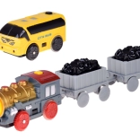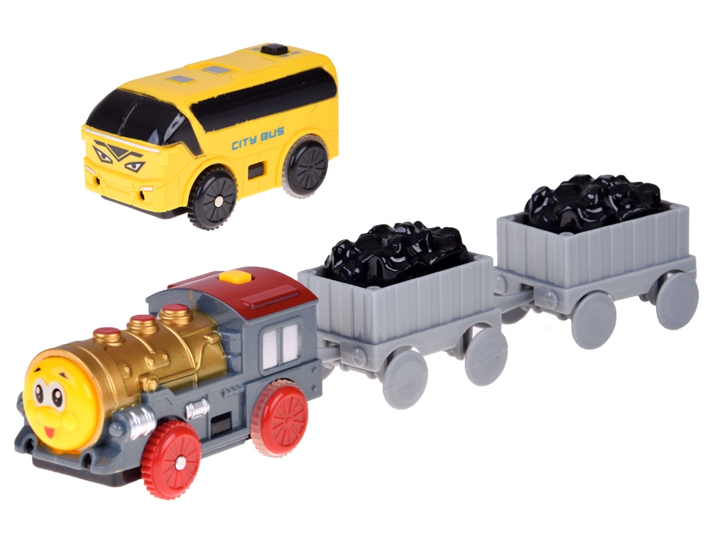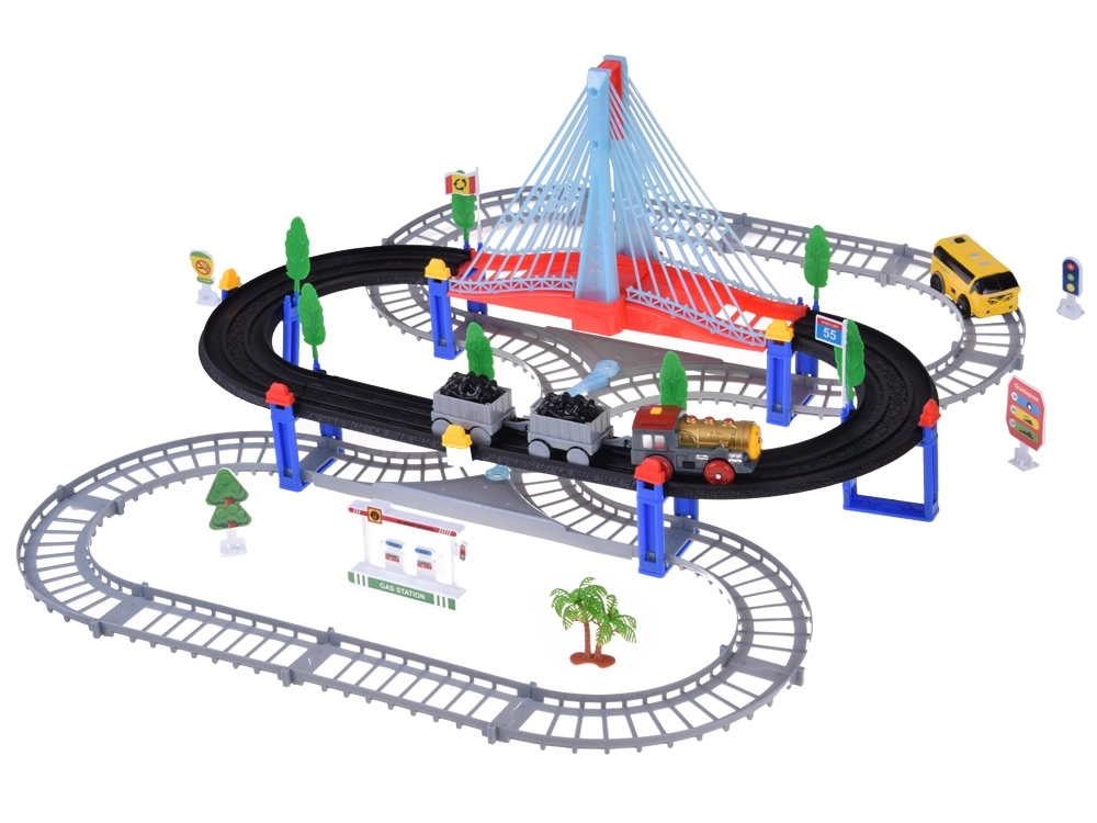 - Locomotiva, 2 vagoni, autobus urbano, segmenti di tracciato, ponte sospeso, accessori (alberi, segnali stradali, barriere, piccola stazione di rifornimento)