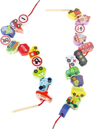 23 perline in legno (veicoli e segnali stradali) + 2 cordini con infilaperle