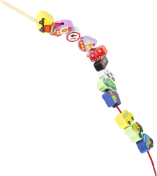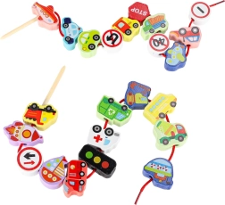 Scoprite un set creativo per bambini che unisce apprendimento e divertimento. Le colorate perline in legno a forma di veicoli e segnali stradali si infilano su cordini con aghini, favorendo la motricità fine, la coordinazione occhio–mano, la pazienza e il riconoscimento di colori e forme. I pezzi in legno naturale sono resistenti e sicuri per il gioco quotidiano.