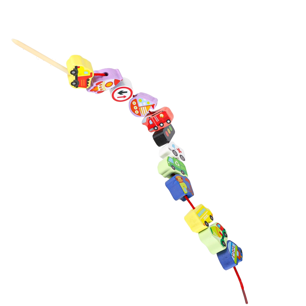 Infilare le perline allena la precisione delle dita, la presa e la concentrazione. I bambini esercitano giocando la coordinazione occhio–mano e acquisiscono sicurezza nei movimenti delicati.