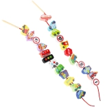 I pezzi in legno, accuratamente levigati, sono piacevoli al tatto e resistenti per il gioco quotidiano. I cordini con infilaperle facilitano il passaggio e invogliano alla creazione.