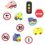 Veicoli colorati, semafori e segnali introducono i bambini al mondo della circolazione. L’apprendimento delle regole stradali avviene in modo naturale durante la composizione e la classificazione.