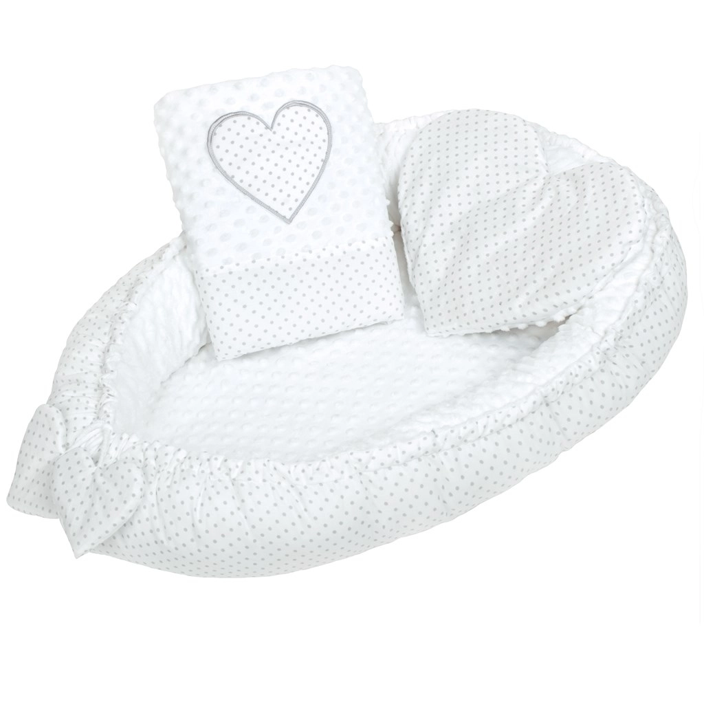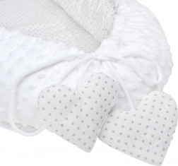 Il comodo e sicuro nido per neonati New Baby Minky Cuoricino in colore bianco combina morbida stoffa Minky extra soffice e cotone 100% per il massimo comfort. Grazie al laccetto regolabile puoi adattare facilmente la misura e creare per il bambino un ambiente accogliente e protetto per lettino, passeggino e divano. Inclusi cuscinetto a forma di cuore e piumino con cuoricino.