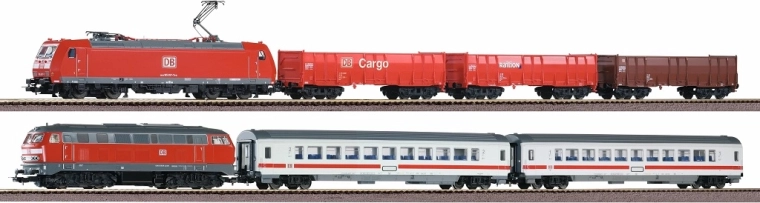 Nella confezione trovi la locomotiva diesel BR 218 con due carrozze IC e la locomotiva elettrica BR 185 con tre carri a sponde alte: combinazione ideale per traffico passeggeri e merci.