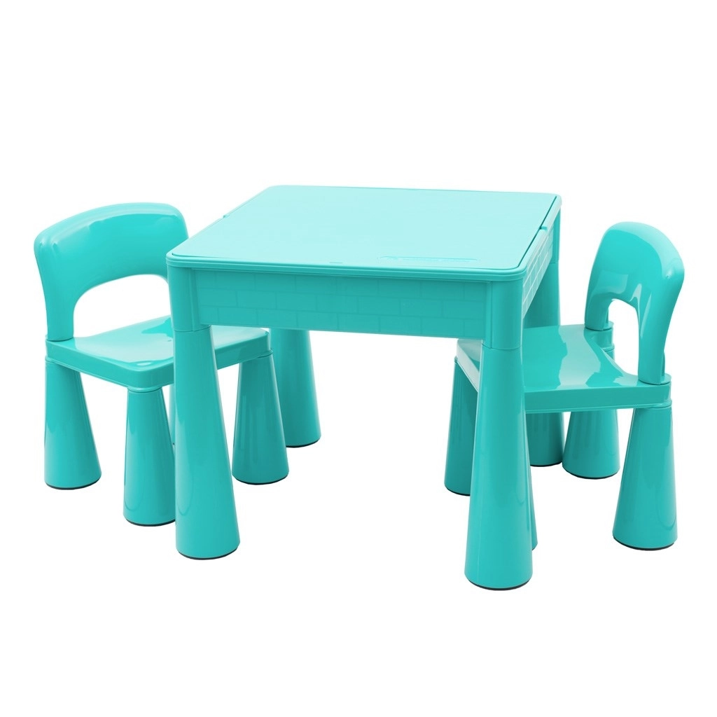 Pratico set per bambini New Baby composto da un tavolo e due sedie in moderno colore menta. Il tavolo ha un piano reversibile – da un lato superficie liscia, dall’altro base per LEGO e LEGO DUPLO. Sotto il piano si trova uno spazio contenitore per giocattoli e materiale creativo, utilizzabile anche come mini sabbiera o per giochi d’acqua. Ideale per la cameretta e la stanza dei giochi.