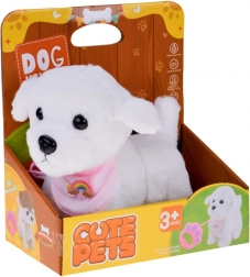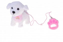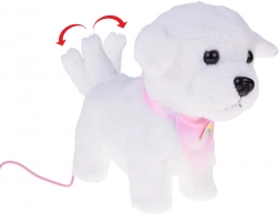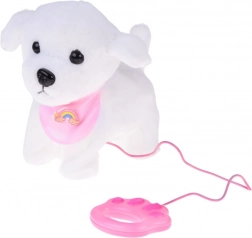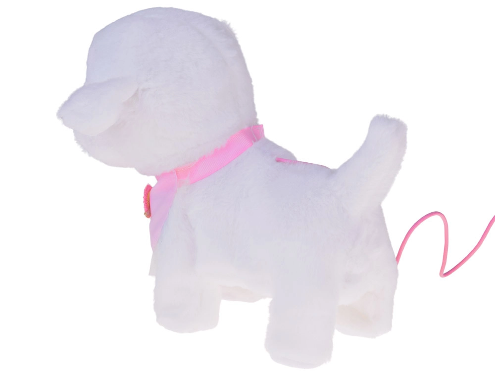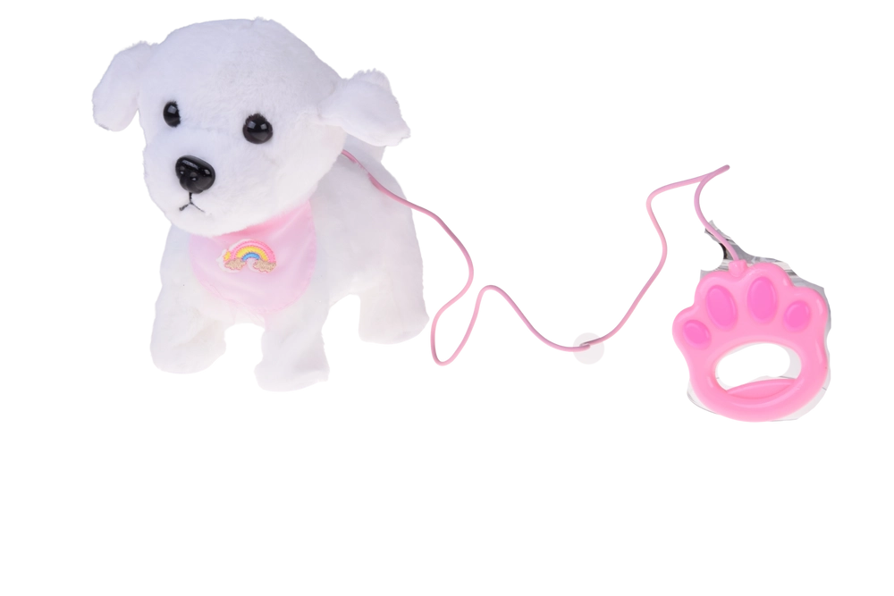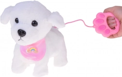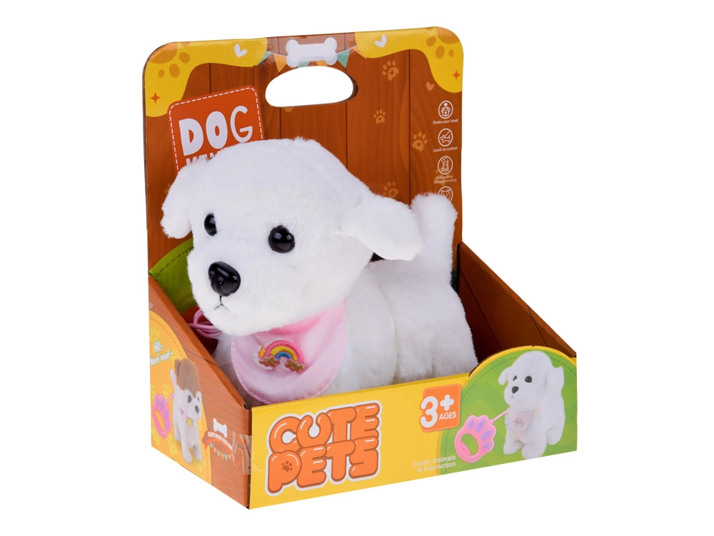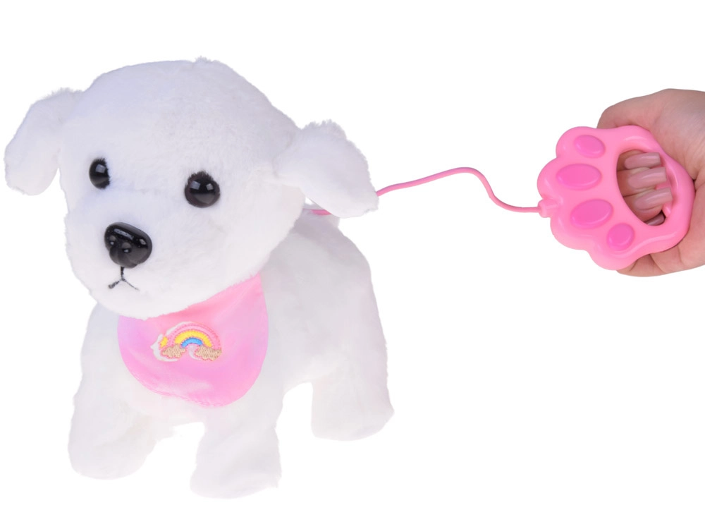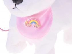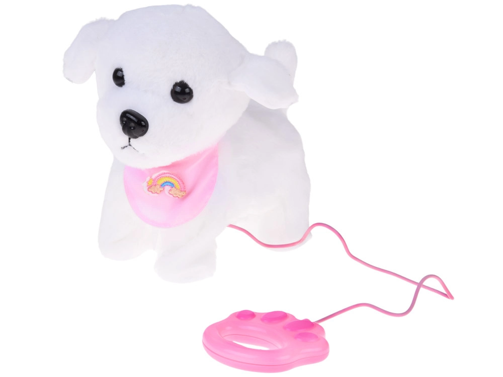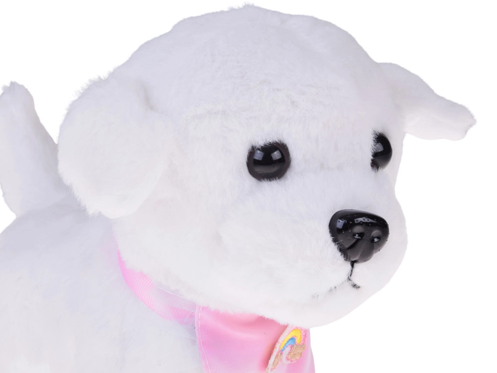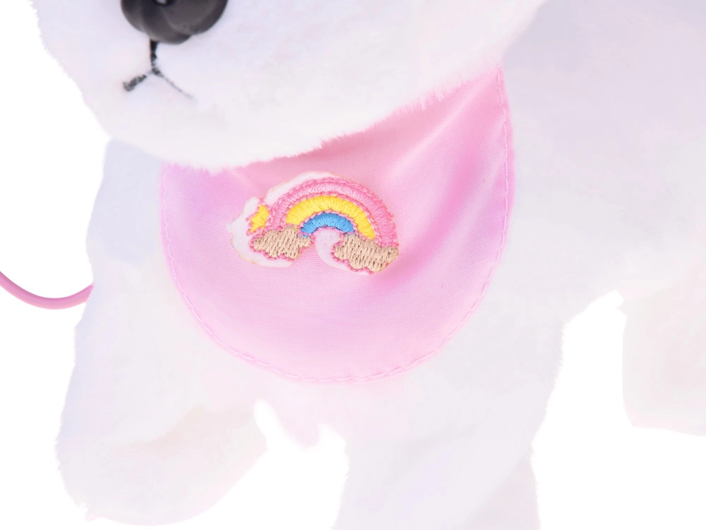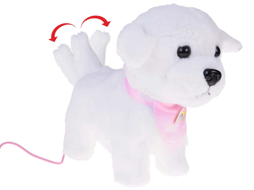 Il dolce cagnolino di peluche interattivo con guinzaglio farà felici tutti i piccoli amanti degli animali. Premendo il pulsante sul guinzaglio cammina, abbaia, emette suoni realistici e scodinzola. È realizzato in materiale morbido e piacevole al tatto ed è decorato con una carinissima bandana con arcobaleno – il compagno ideale per il gioco quotidiano e un regalo perfetto.