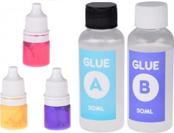 Stampo per 2 slime, bastoncino per mescolare, pinzette, 2× colla (A+B), misurino, spugnetta/applicatore, 3× colorante, morbide palline decorative, guanti protettivi, 2× stellina, 4× bicchierino trasparente, 2× sacchetto decorativo, 2× catenella per ciondolo, vassoietto