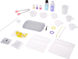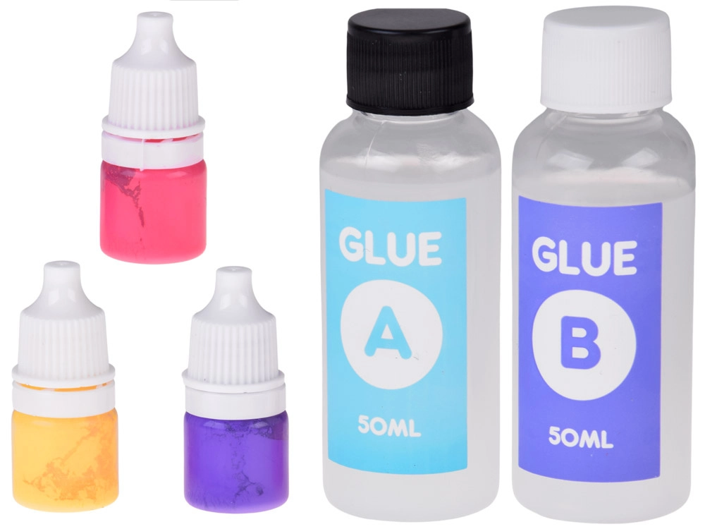 Il set comprende misurini, ciotole, soluzioni A e B, coloranti, bastoncini, perline e sacchetti: tutto il necessario per mescolare, colorare, decorare e conservare lo slime.