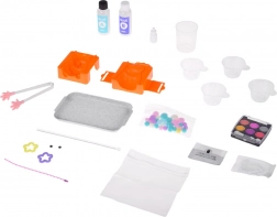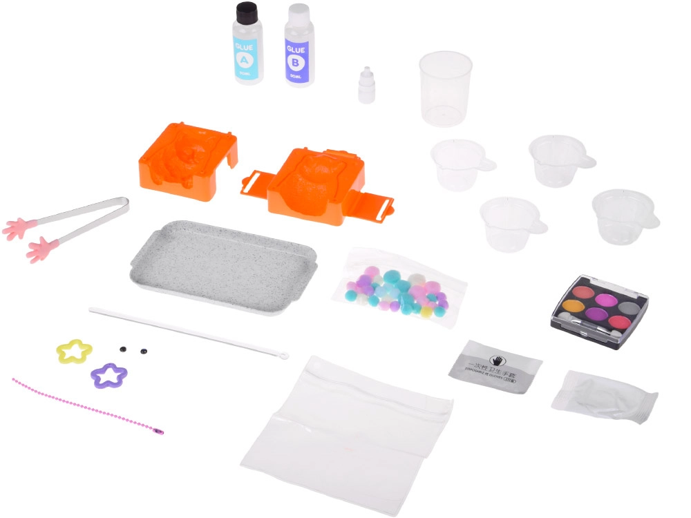 stampo, pinzette, spatolina per mescolare, 2× colla (A e B), misurino, colorante/pigmento, ombretto con applicatore, morbide palline decorative, peluria, guanti protettivi, stelline, occhietti, 4× bicchierino trasparente, sacchetto decorativo, catenella per portachiavi, vassoio