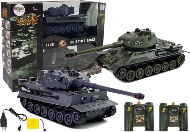 Entra nell’azione con la coppia di carri armati RC T‑34 e TIGER 103 ricchi di dettagli. Ogni carro ha una torretta mobile con cannone ed è controllabile in tutte le direzioni. Grazie al sistema di combattimento a infrarossi ti godrai duelli leali: dopo un colpo le vite diminuiscono e il comportamento del carro cambia fino alla sconfitta.