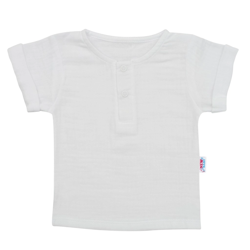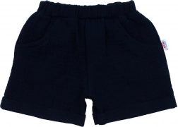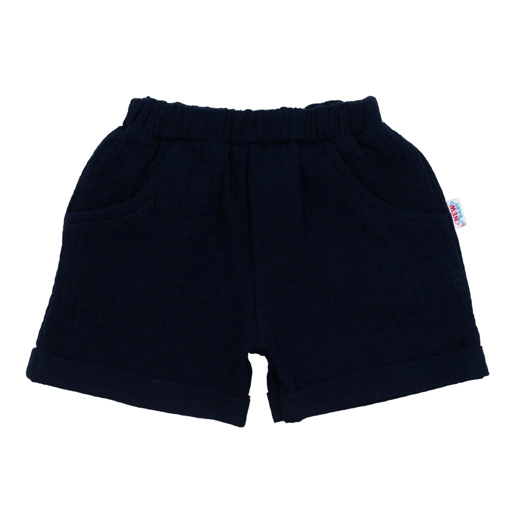 Leggero e traspirante set in mussola a due pezzi per neonati del marchio New Baby in colore blu scuro. Include una maglietta a maniche corte e shorts con comodo elastico più largo in vita, che non preme sul pancino. La mussola in 100% cotone è morbida, traspirante e ideale per le giornate estive.