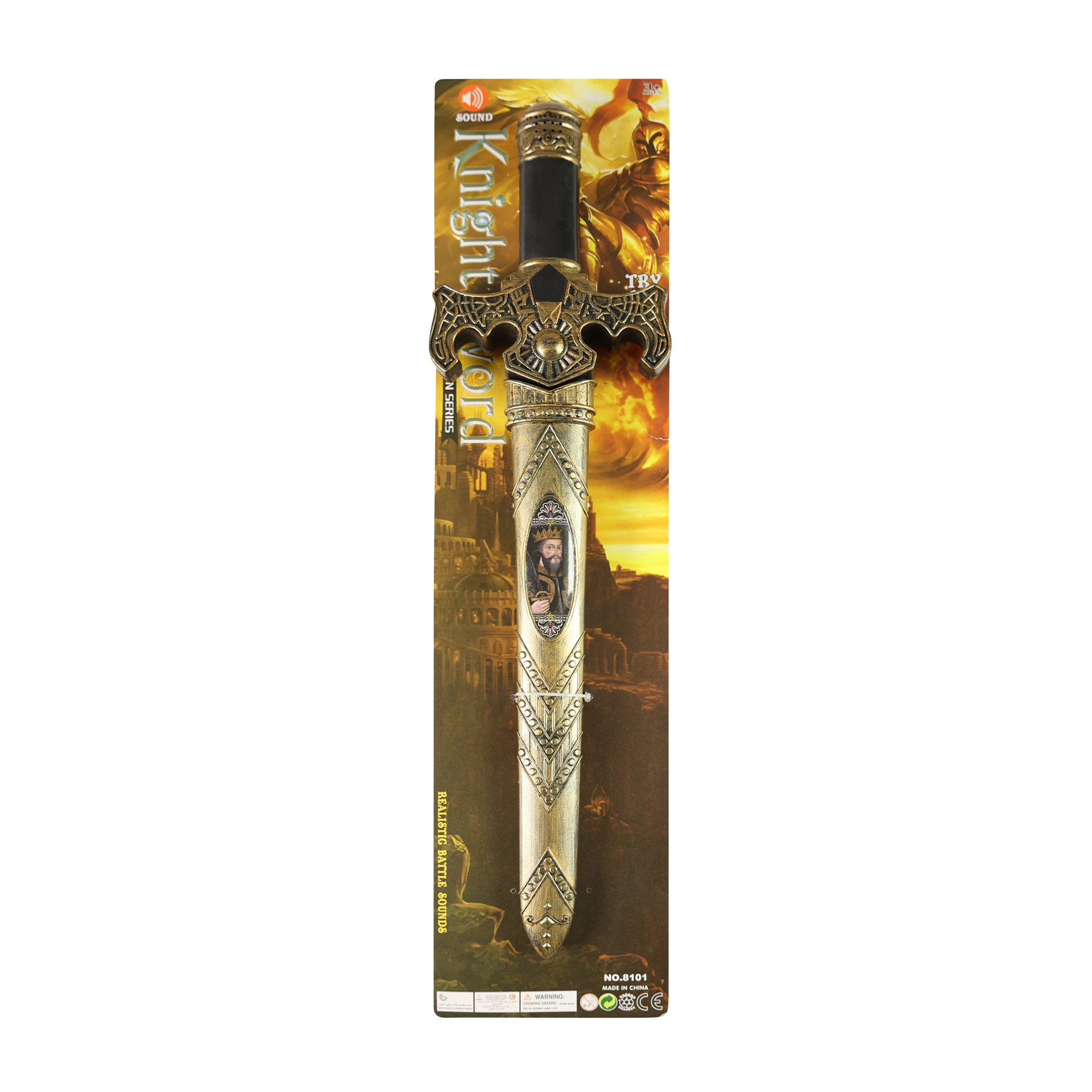 La spada ha una comoda lunghezza di 55 cm, è facile da impugnare e leggera, quindi adatta ai bambini. I suoni sono alimentati da 2 batterie AA posizionate nell’impugnatura (non incluse).