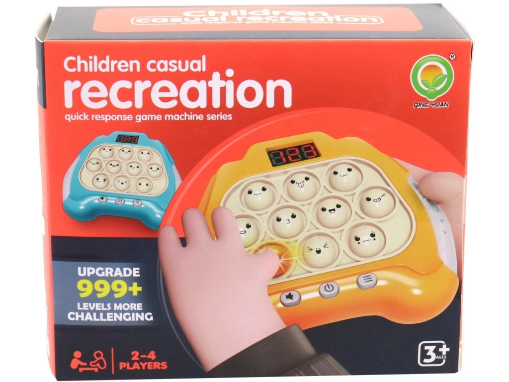 Divertente gioco di prontezza per 2–4 giocatori, perfetto per bambini a partire da 3 anni. Gioco compatto in plastica con dimensioni 10 × 6 × 12,5 cm e regole semplici, ideale a casa e in viaggio. Per il funzionamento sono necessarie 3 batterie AAA (non incluse).