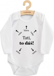 Dolcissimo body per neonato NEW BABY a maniche lunghe con la scritta Papà, ce la farai!, realizzato in 100% cotone per il massimo comfort. I colori della stampa sono certificati e sicuri per i bebè. La pratica chiusura a bottoncini a pressione sulla spalla e tra le gambine facilita la vestizione e il cambio.