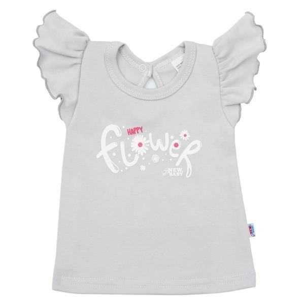 Delizioso set a due pezzi per neonati New Baby Happy Flower in colore grigio, che unisce comfort e stile per ogni giorno. Include una maglietta con la scritta Happy flower e maniche a volant, e dei pantaloni con stampa floreale all-over. Grazie al 100% cotone è delicato sulla pelle sensibile del bambino e la pratica chiusura a bottoncino sul collo facilita la vestizione.