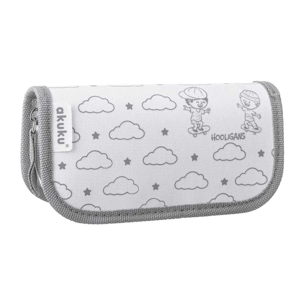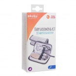 Pratico set iniziale per la cura del neonato Akuku Hooligans in custodia tessile, ideale per i neonati e anche come regalo. Contiene tutto il necessario per un'igiene sicura e la cura di unghie e capelli – forbicine con punte arrotondate, tagliaunghie, limetta, spazzola morbida con setole naturali, pettine con manico antiscivolo e aspiratore nasale con punta morbida. Senza BPA.